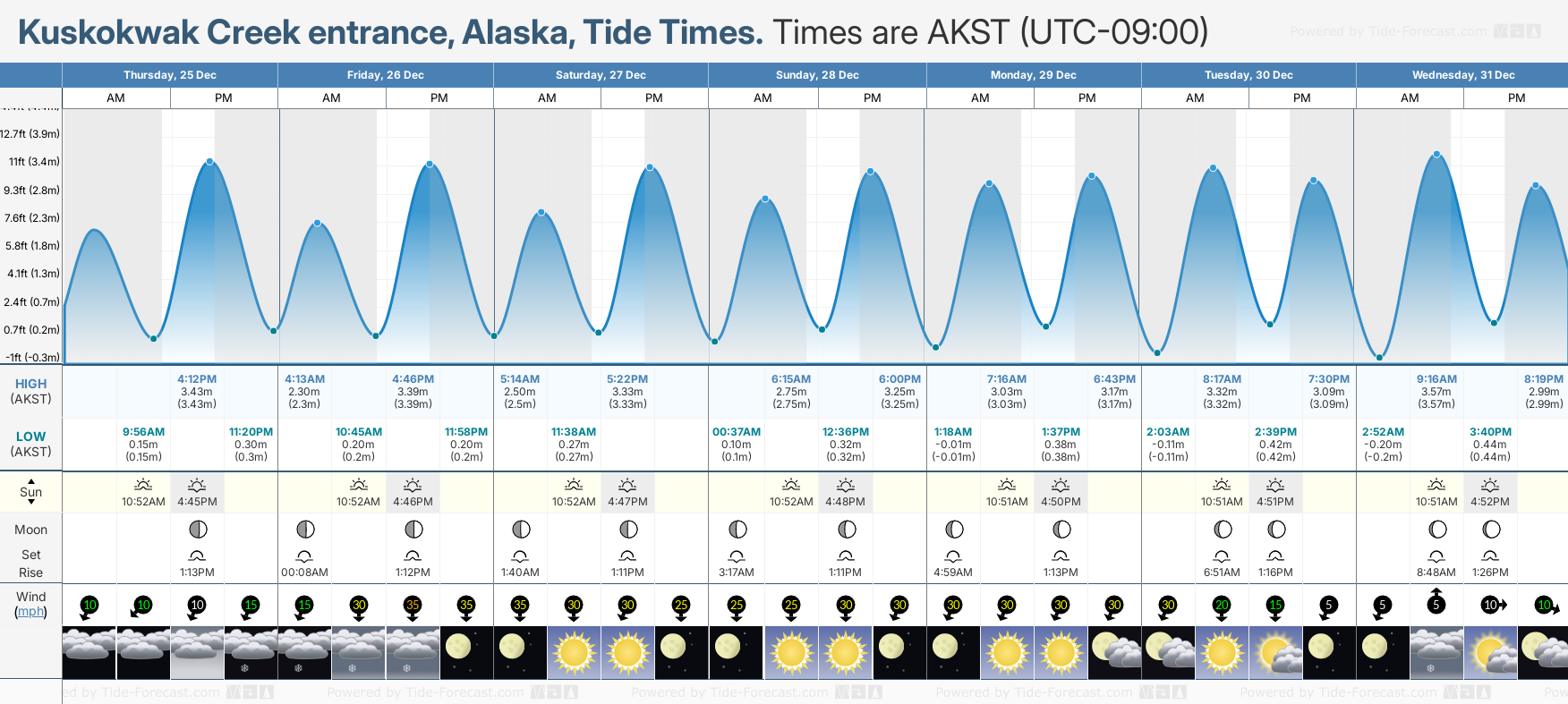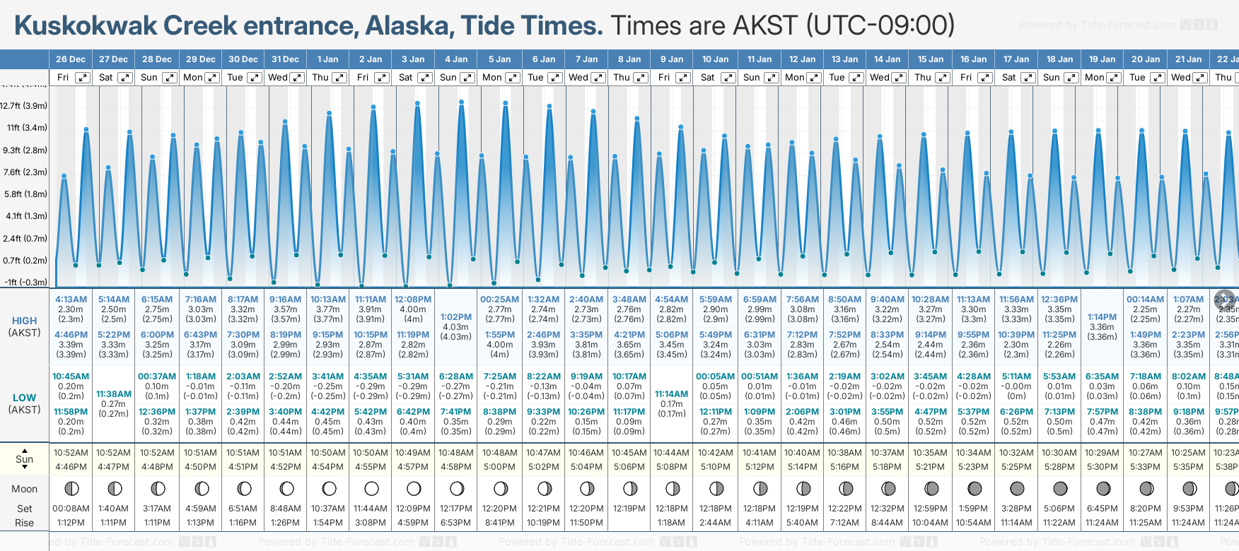 December and January Tide charts for Kuskokwak Creek entrance: The tide charts below show the height, time and date of high and low tides for the next 30 days.