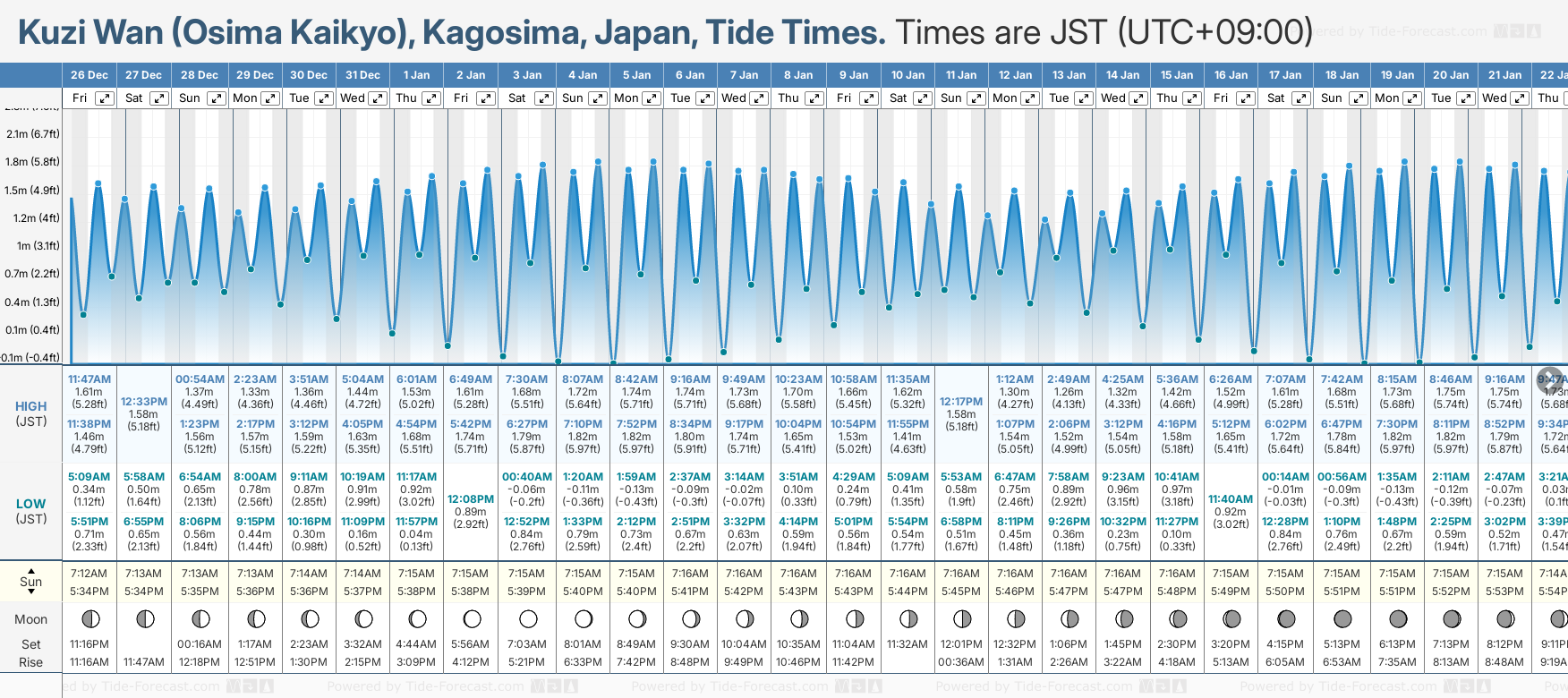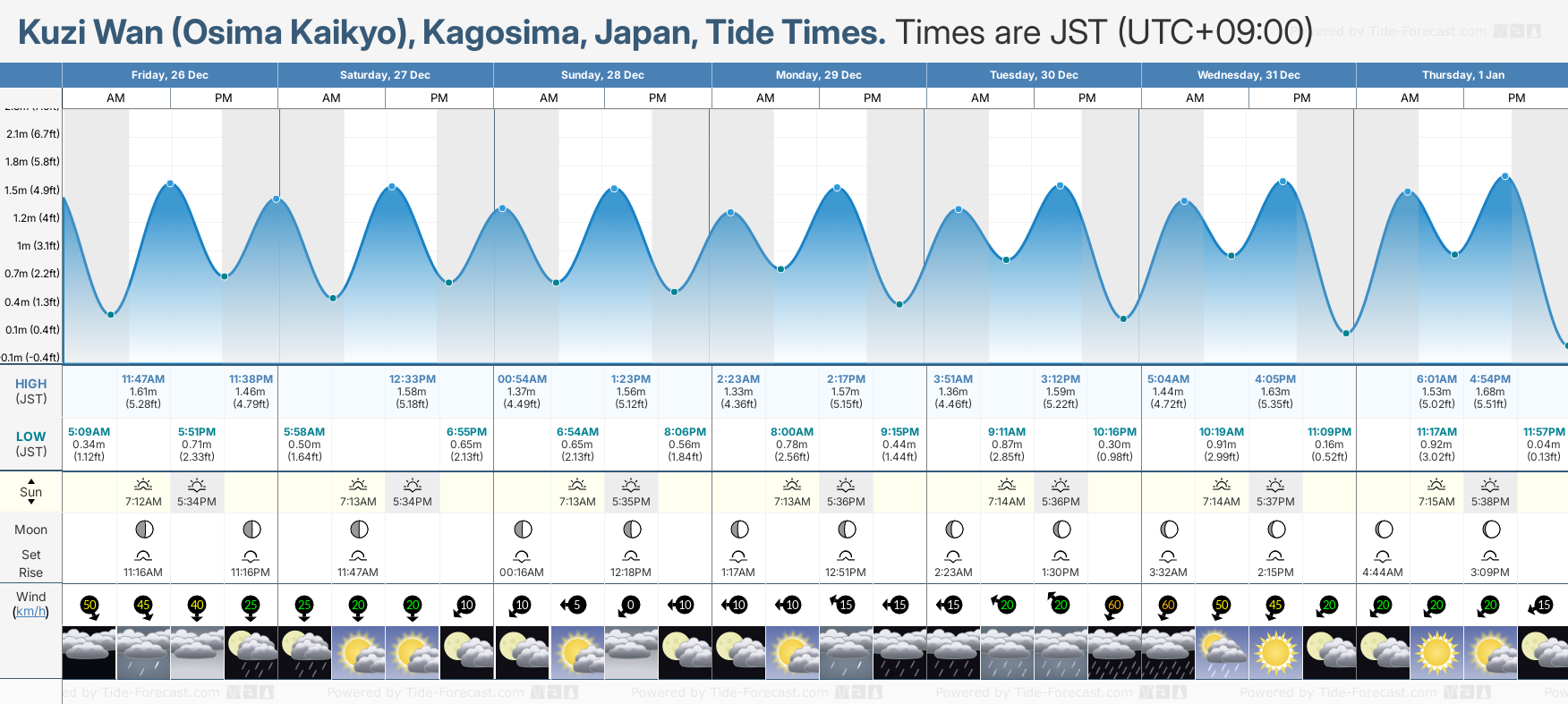 December and January Tide charts for Kuzi Wan (Osima Kaikyo): The tide charts below show the height, time and date of high and low tides for the next 30 days.