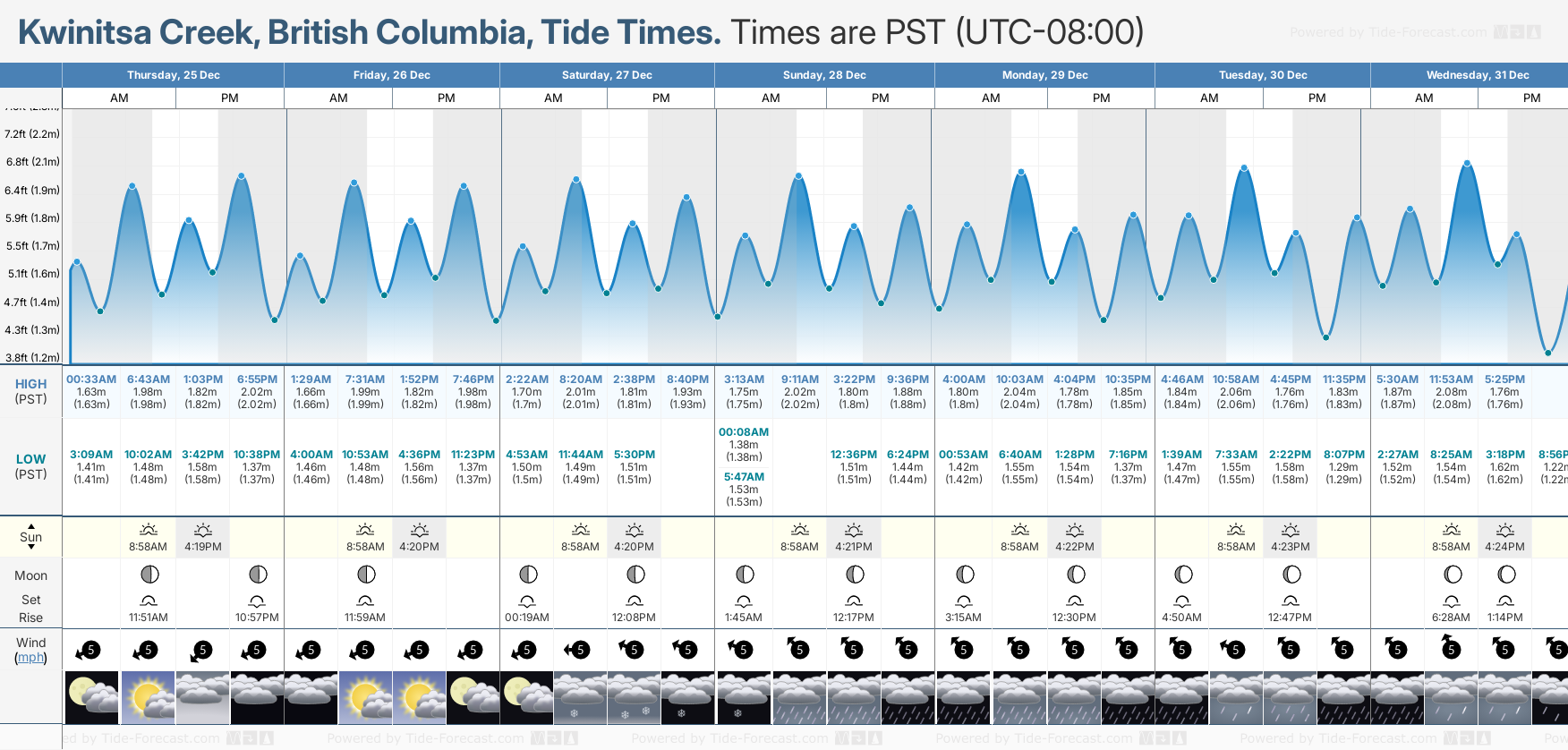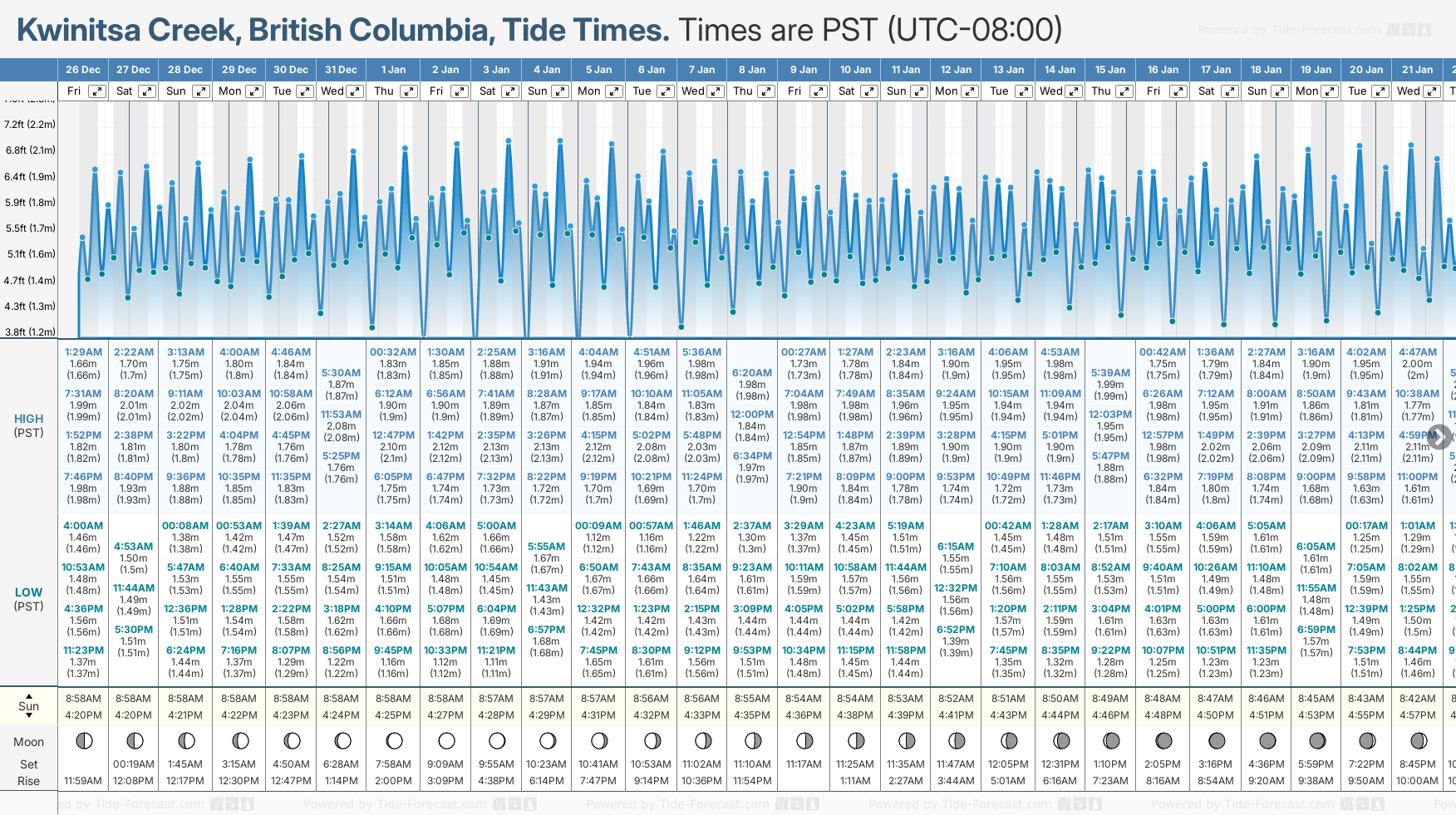 December and January Tide charts for Kwinitsa Creek: The tide charts below show the height, time and date of high and low tides for the next 30 days.