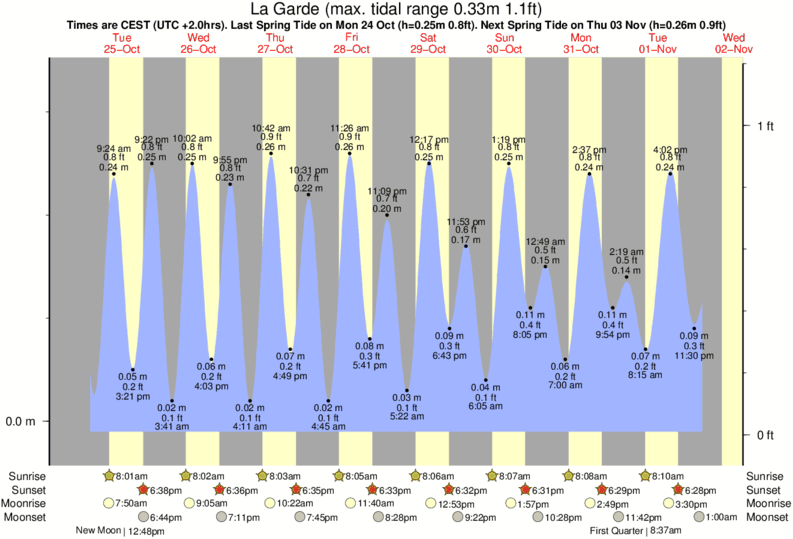 Tide Times are CET (UTC +1.0hrs). Last Spring High Tide at La Garde was on Sun 07 Dec (height: 0.30m 1.0ft). Next high Spring Tide at La Garde will be on Sun 21 Dec (height: 0.26m 0.9ft).