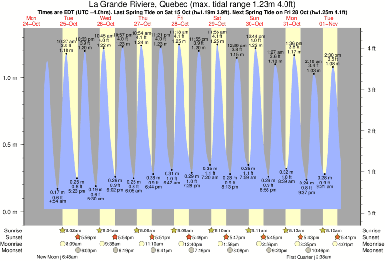 Tide chart for La Grande RiviereShowing low and high tide times for the next 30 days at La Grande Riviere. Tide Times are EST (UTC -5.0hrs).