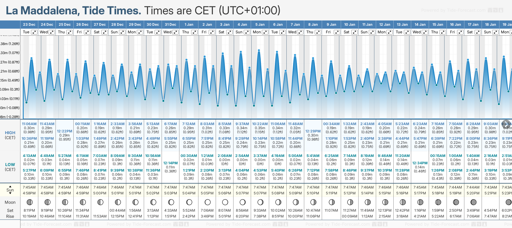 Tide Times are CET (UTC +1.0hrs). Last Spring High Tide at La Maddalena was on Tue 23 Dec (height: 0.30m 1.0ft). Next high Spring Tide at La Maddalena will be on Mon 05 Jan (height: 0.35m 1.1ft).