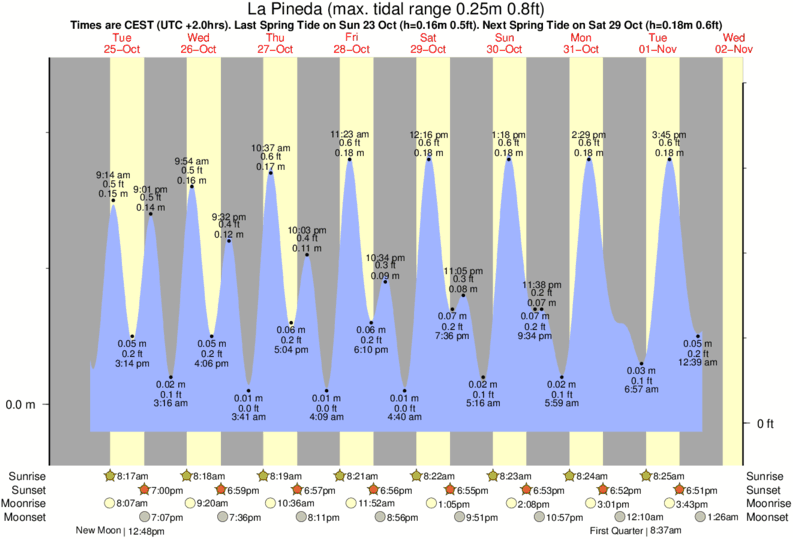 Tide Times are CET (UTC +1.0hrs). Last Spring High Tide at La Pineda was on Sat 20 Dec (height: 0.19m 0.6ft). Next high Spring Tide at La Pineda will be on Sat 03 Jan (height: 0.22m 0.7ft).
