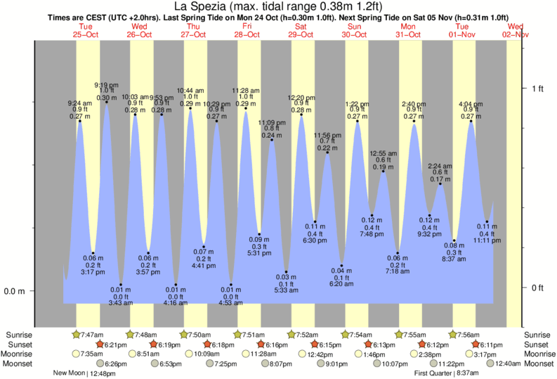 Tide Times are CET (UTC +1.0hrs). Last Spring High Tide at La Spezia was on Sat 20 Dec (height: 0.30m 1.0ft). Next high Spring Tide at La Spezia will be on Mon 05 Jan (height: 0.34m 1.1ft).