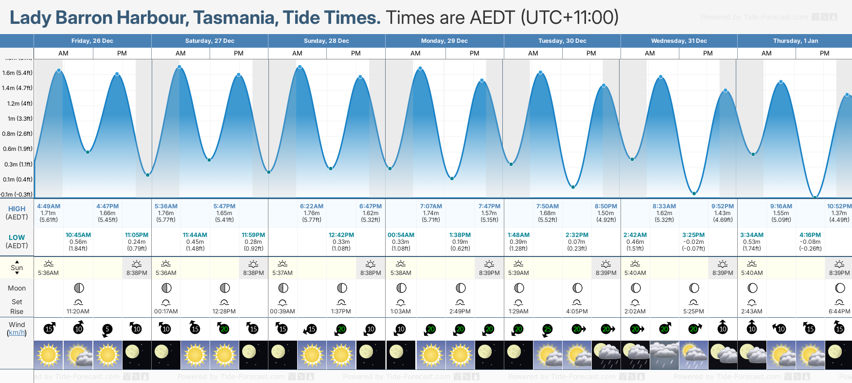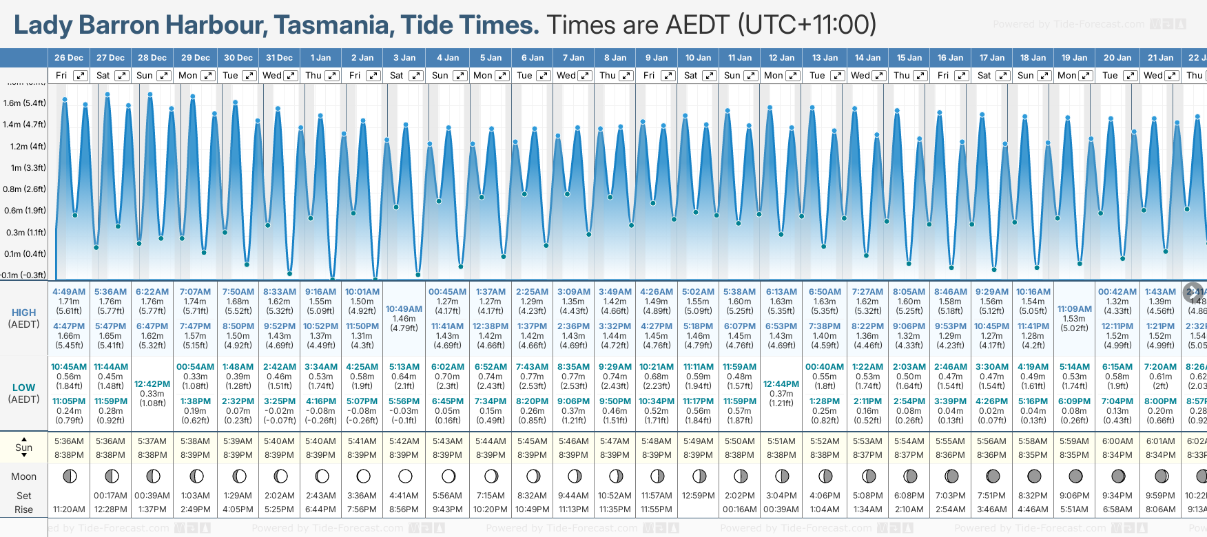 December and January Tide charts for Lady Barron Harbour: The tide charts below show the height, time and date of high and low tides for the next 30 days.