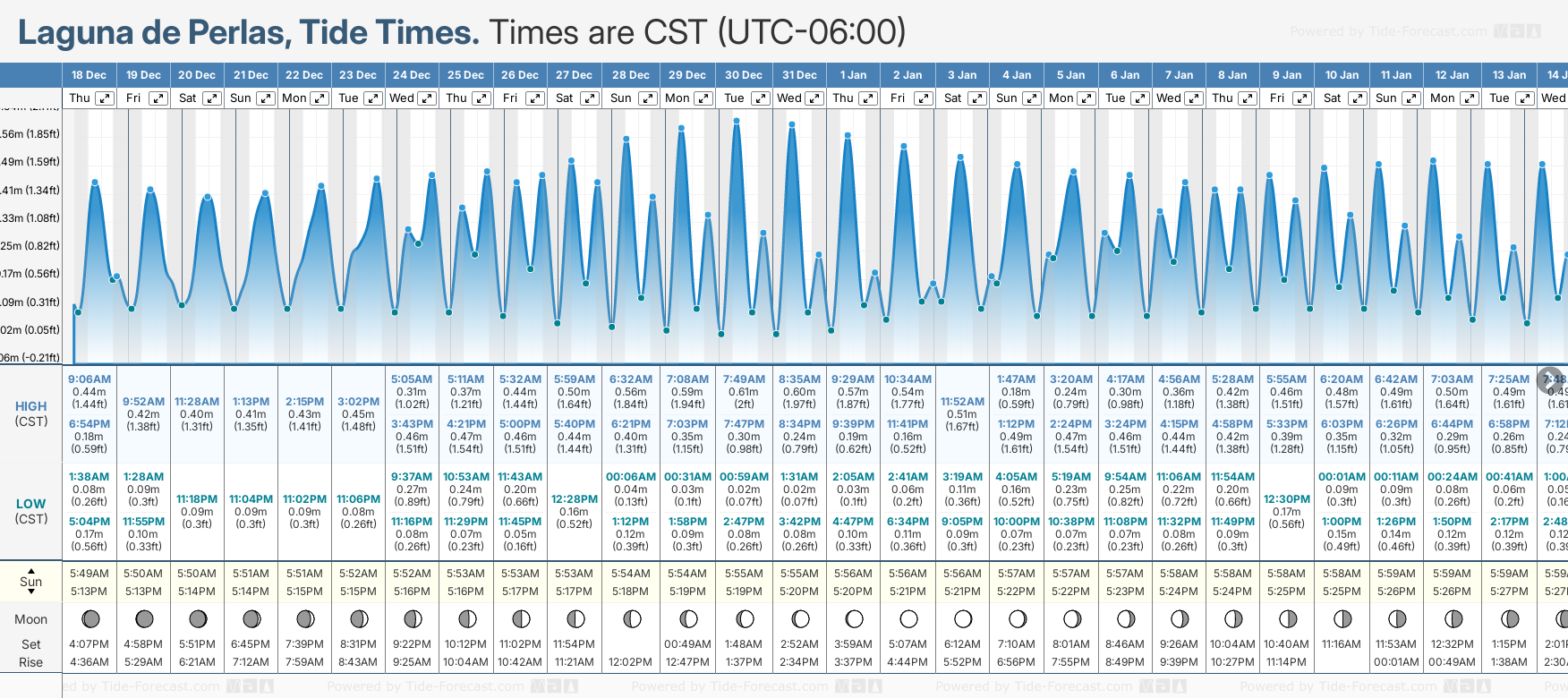 Tide Times are CST (UTC -6.0hrs). Last Spring High Tide at Laguna de Perlas was on Mon 15 Dec (height: 0.49m 1.6ft). Next high Spring Tide at Laguna de Perlas will be on Tue 30 Dec (height: 0.61m 2.0ft).