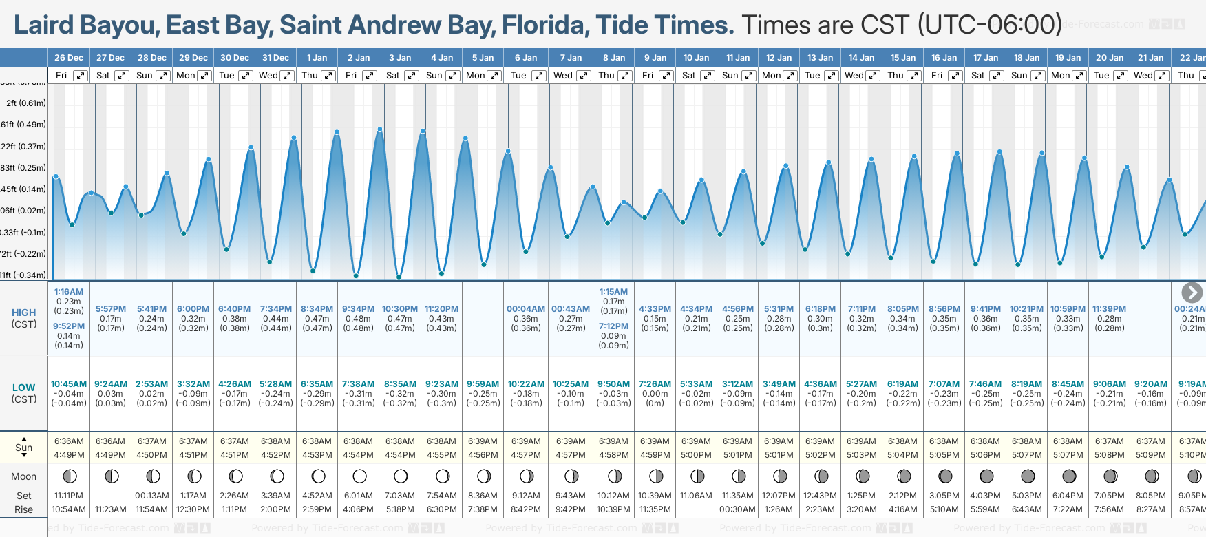 December and January Tide charts for Laird Bayou, East Bay, Saint Andrew Bay: The tide charts below show the height, time and date of high and low tides for the next 30 days.