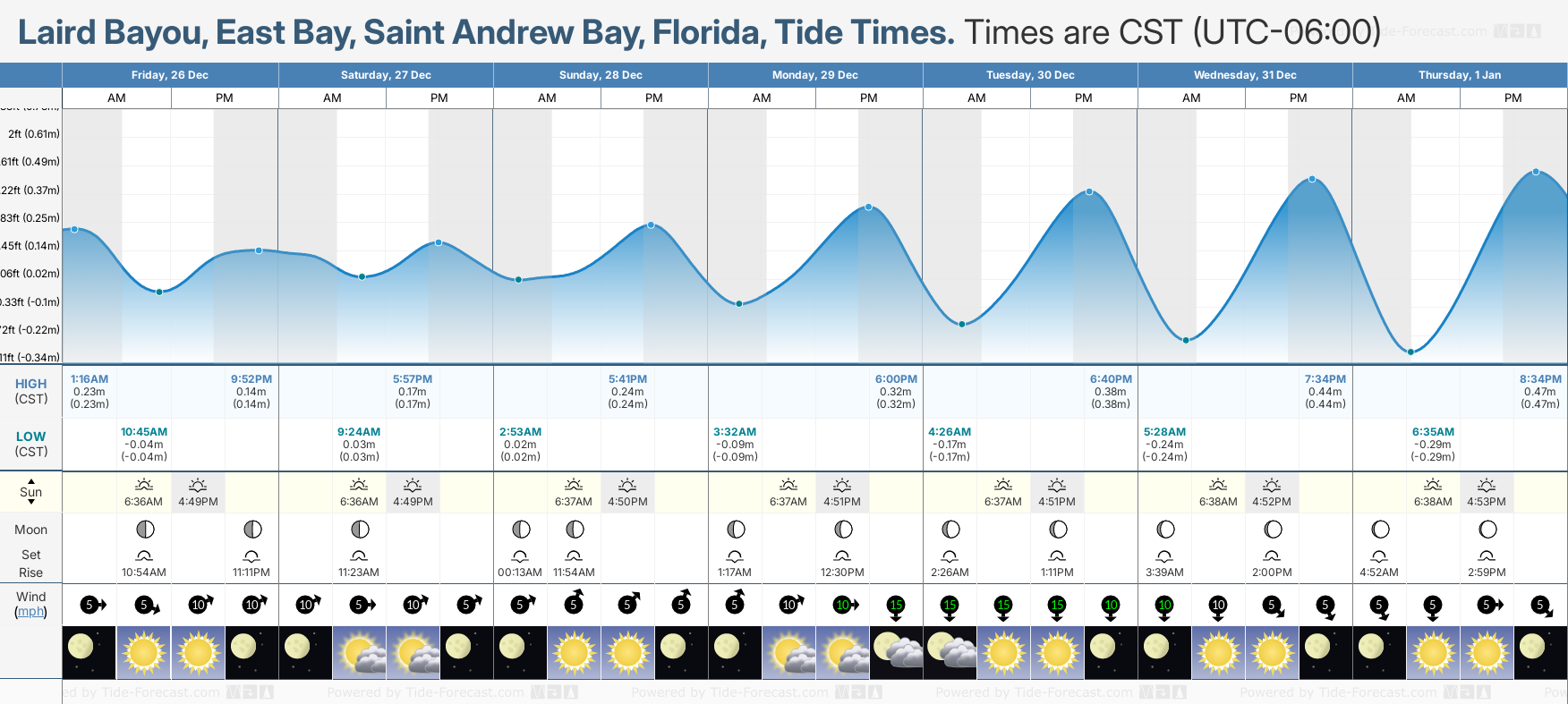 Tide Times are CST (UTC -6.0hrs). Last Spring High Tide at Laird Bayou, East Bay, Saint Andrew Bay was on Sun 21 Dec (height: 0.43m 1.4ft). Next high Spring Tide at Laird Bayou, East Bay, Saint Andrew Bay will be on Fri 02 Jan (height: 0.48m 1.6ft).