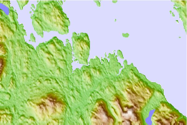 Use this relief map to navigate to tide stations, surf breaks and cities that are in the area of Lake Bay, Alaska.