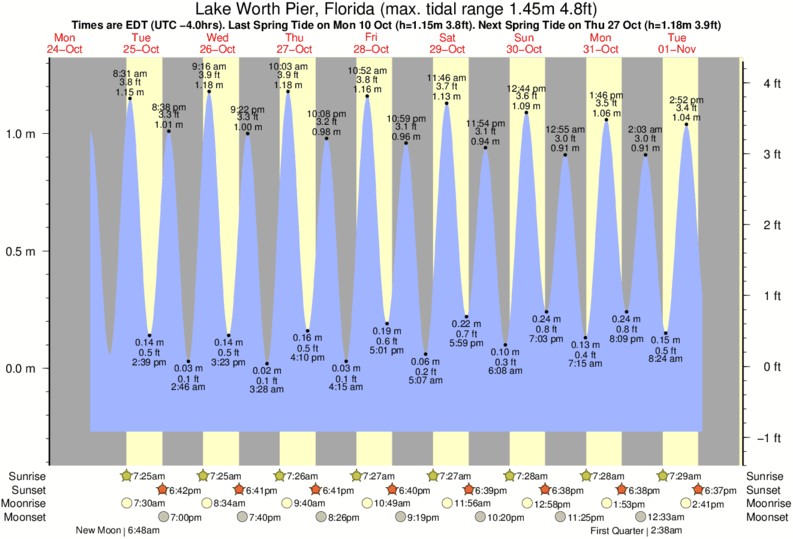 Tide Times are EST (UTC -5.0hrs). Last Spring High Tide at Lake Worth Pier was on Sat 20 Dec (height: 0.96m 3.1ft). Next high Spring Tide at Lake Worth Pier will be on Sat 03 Jan (height: 1.09m 3.6ft).