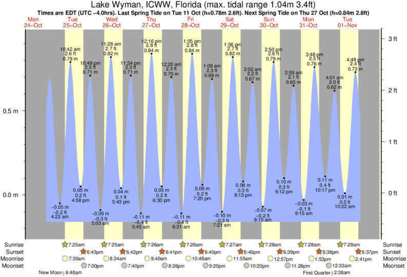 Tide Times are EST (UTC -5.0hrs). Last Spring High Tide at Lake Wyman, ICWW was on Fri 05 Dec (height: 0.88m 2.9ft). Next high Spring Tide at Lake Wyman, ICWW will be on Tue 23 Dec (height: 0.75m 2.5ft).