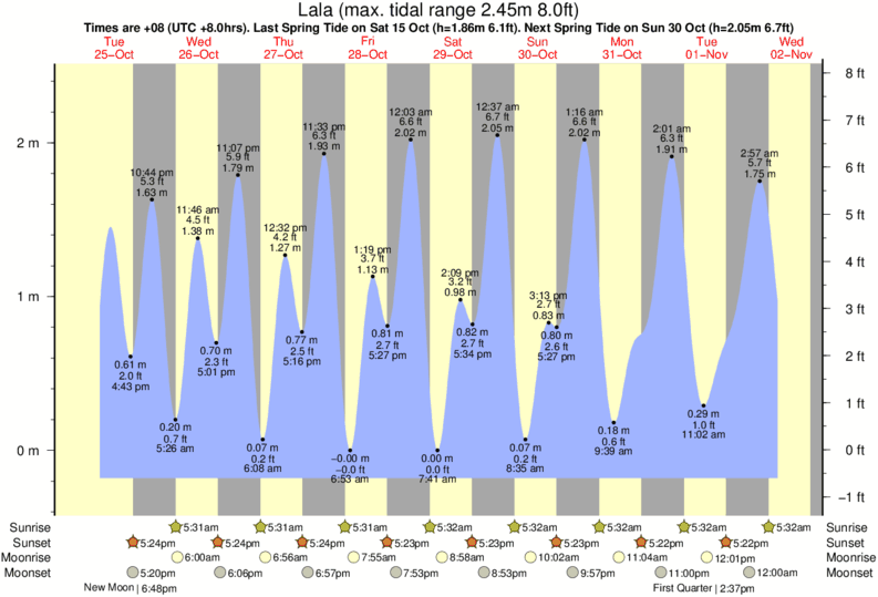 Tide Times are PST (UTC +8.0hrs). Last Spring High Tide at Lala was on Sun 07 Dec (height: 2.26m 7.4ft). Next high Spring Tide at Lala will be on Tue 23 Dec (height: 2.01m 6.6ft).