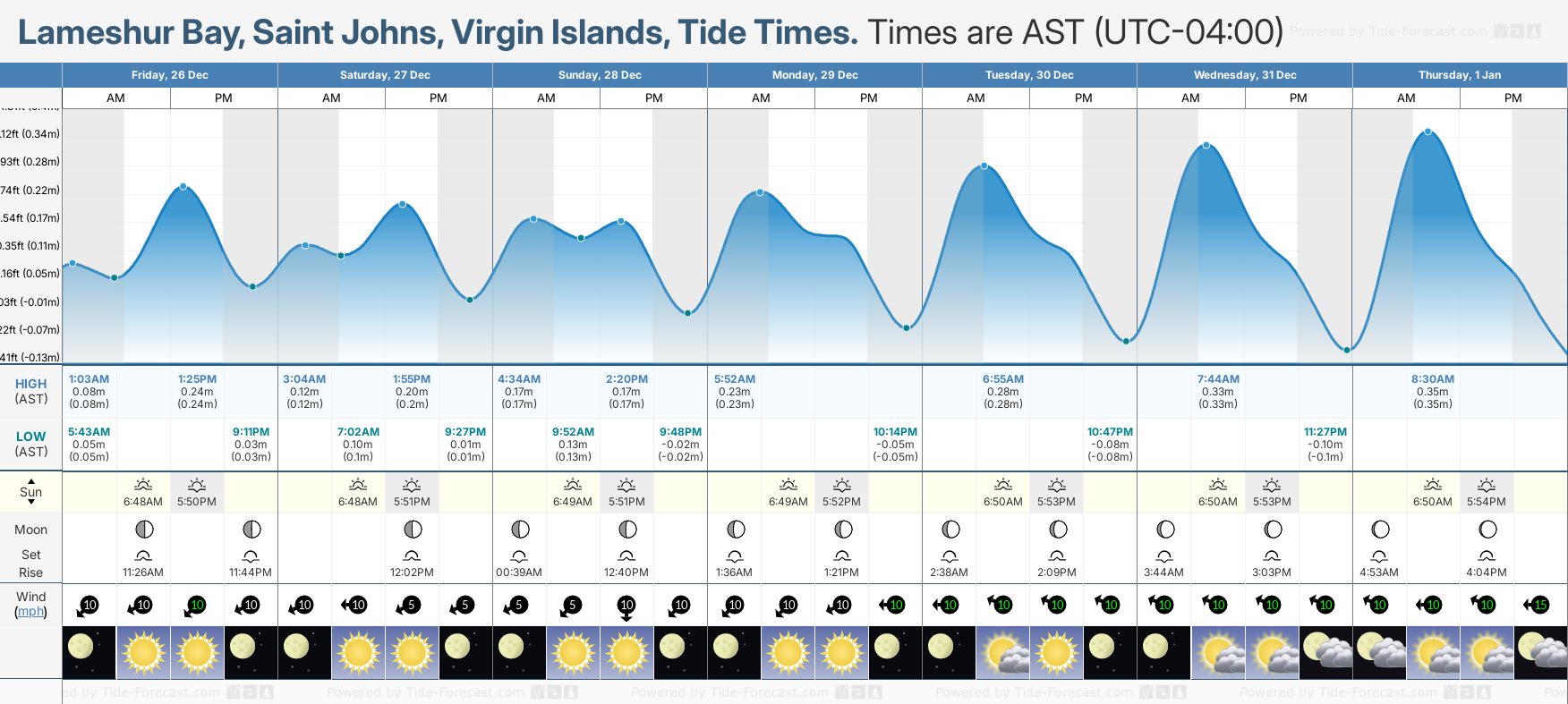 December and January Tide charts for Lameshur Bay, Saint Johns: The tide charts below show the height, time and date of high and low tides for the next 30 days.
