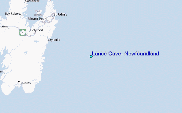 Use this relief map to navigate to tide stations, surf breaks and cities that are in the area of Lance Cove, Newfoundland.