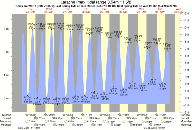 December and January Tide charts for Larache: The tide charts below show the height, time and date of high and low tides for the next 30 days.