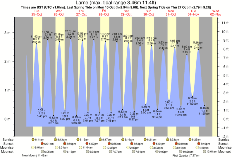 December and January Tide charts for Larne: The tide charts below show the height, time and date of high and low tides for the next 30 days.