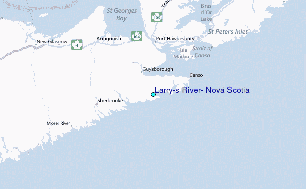 Use this relief map to navigate to tide stations, surf breaks and cities that are in the area of Larry's River, Nova Scotia.