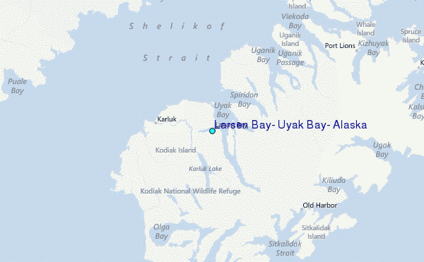 Use this relief map to navigate to tide stations, surf breaks and cities that are in the area of Larsen Bay, Uyak Bay, Alaska.