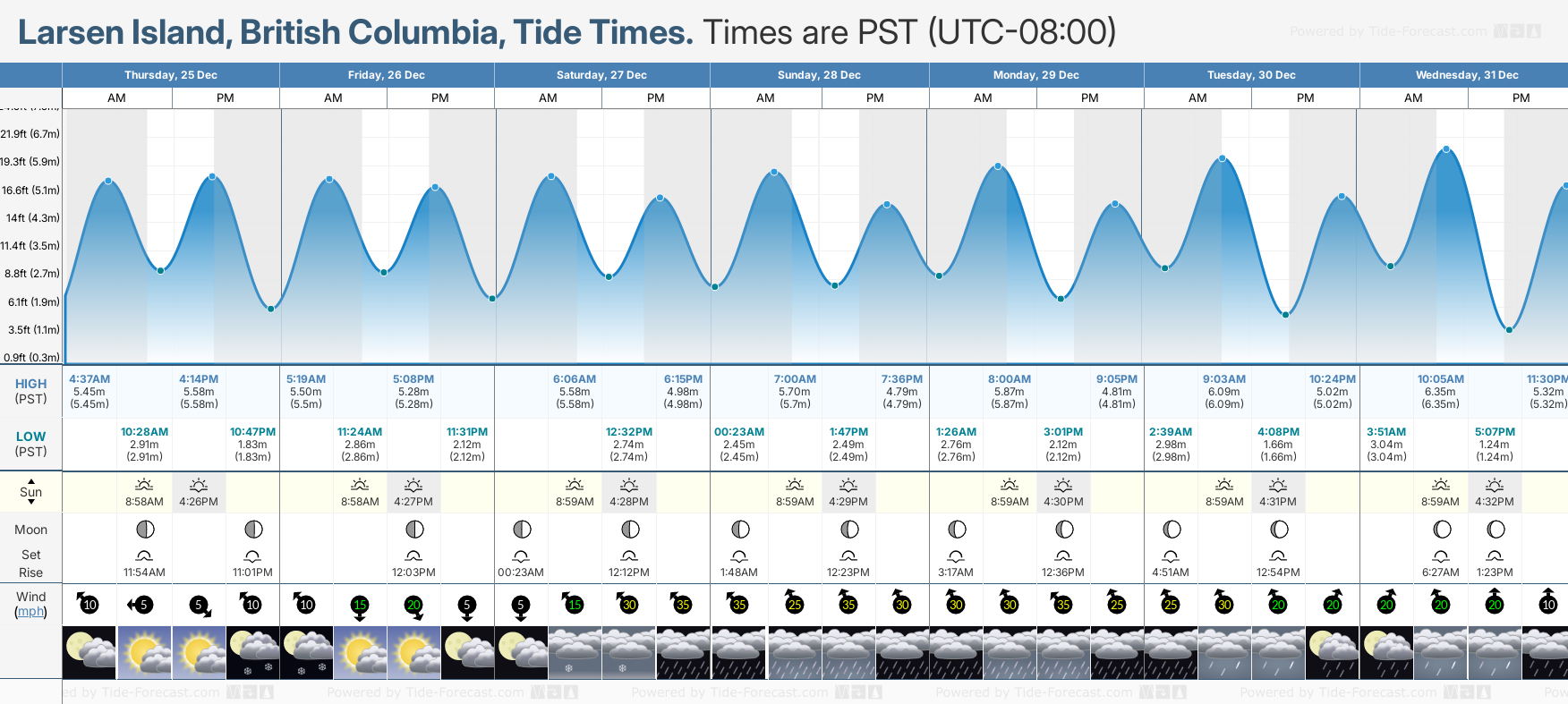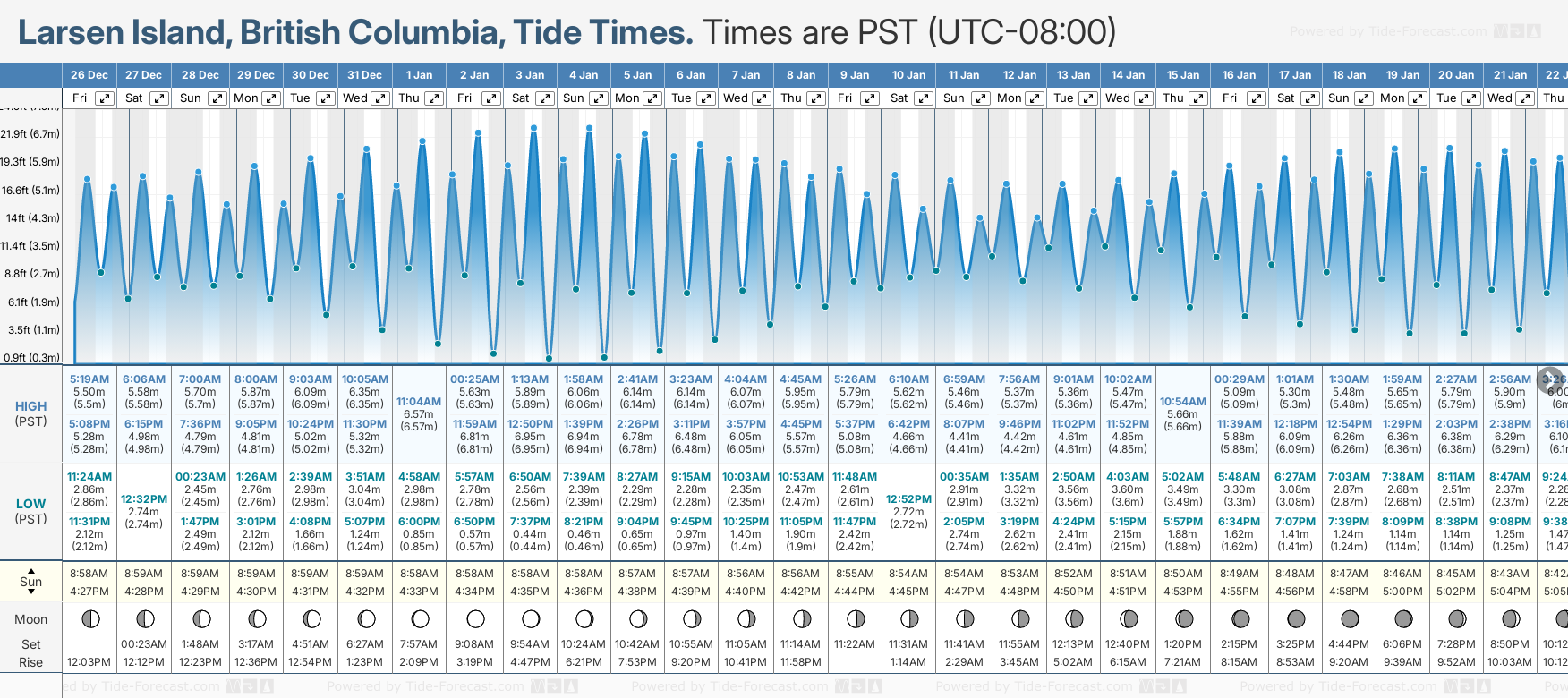 Tide Times are PST (UTC -8.0hrs). Last Spring High Tide at Larsen Island was on Sun 21 Dec (height: 6.17m 20.2ft). Next high Spring Tide at Larsen Island will be on Sat 03 Jan (height: 6.95m 22.8ft).