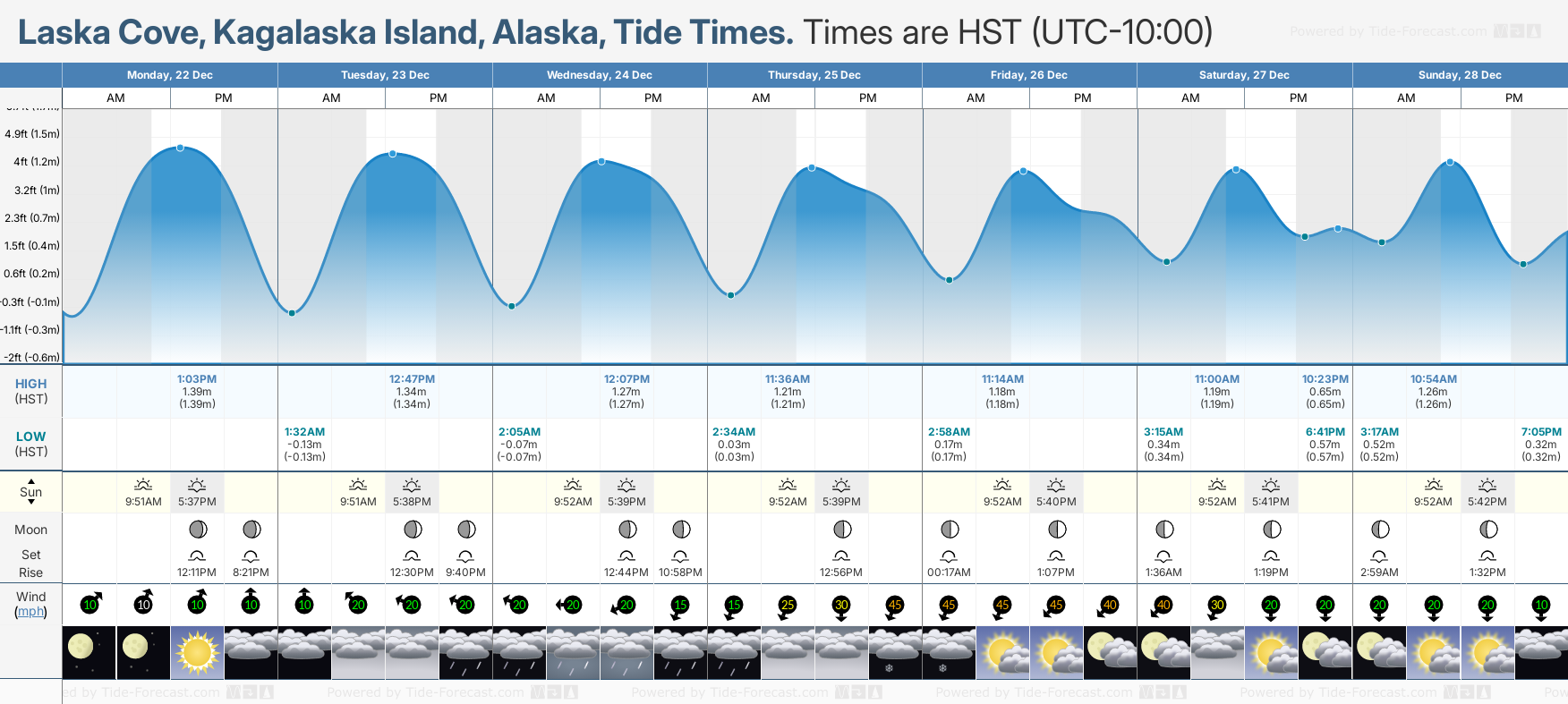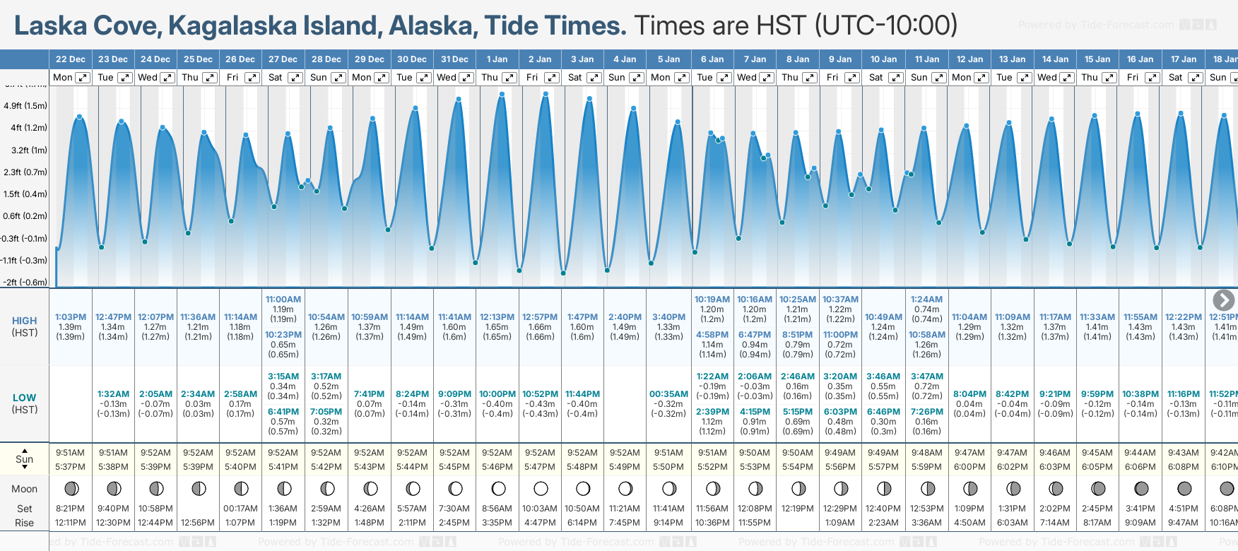 December and January Tide charts for Laska Cove, Kagalaska Island: The tide charts below show the height, time and date of high and low tides for the next 30 days.