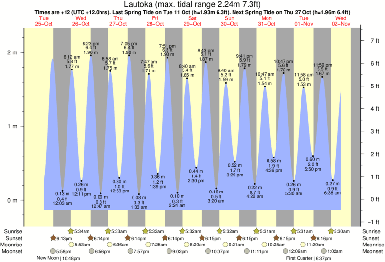 Lautoka tide chart key: The tide chart above shows the height and times of high tide and low tide for Lautoka. The grey shading corresponds to nighttime hours between sunset and sunrise at Lautoka.