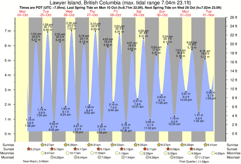Tide Times are PST (UTC -8.0hrs). Last Spring High Tide at Lawyer Island was on Fri 05 Dec (height: 7.27m 23.9ft). Next high Spring Tide at Lawyer Island will be on Sat 20 Dec (height: 6.28m 20.6ft).