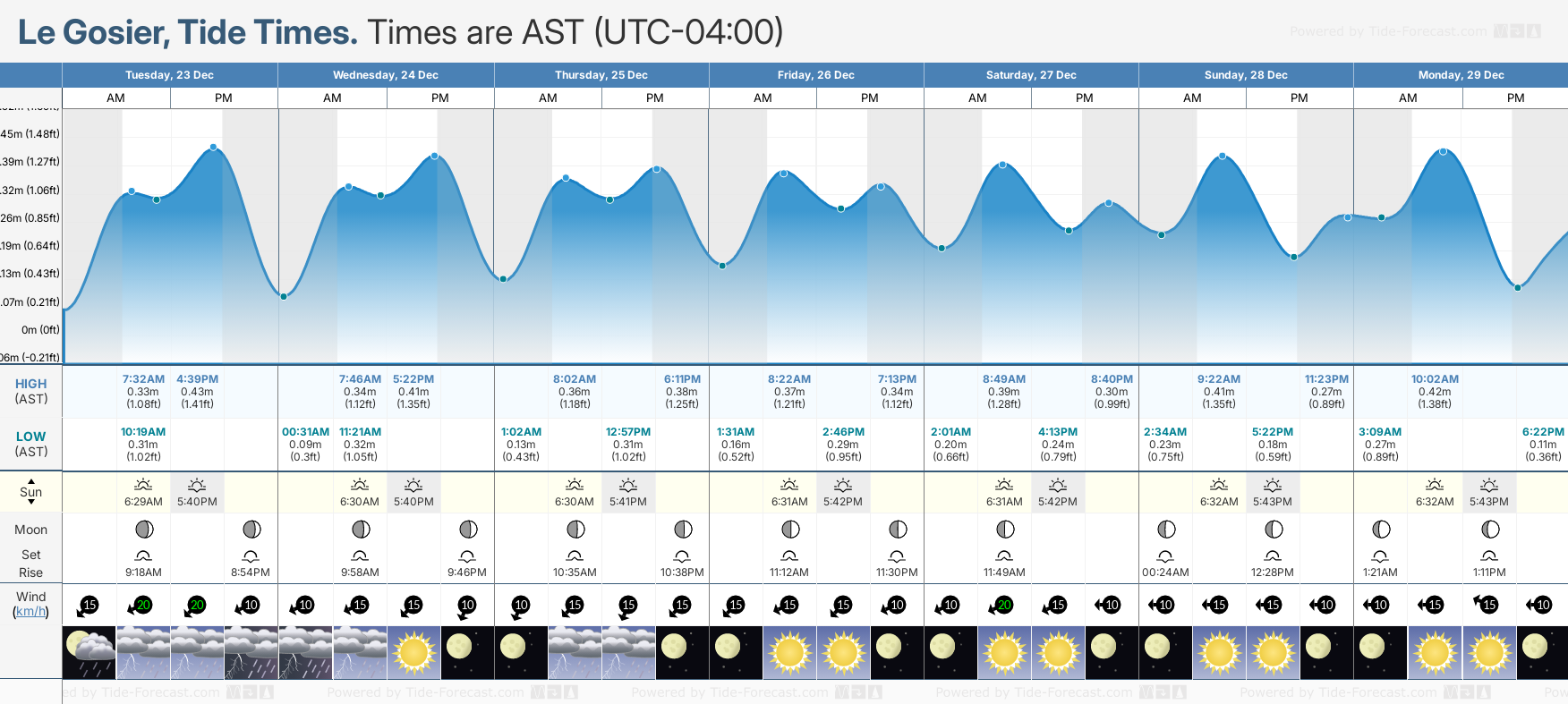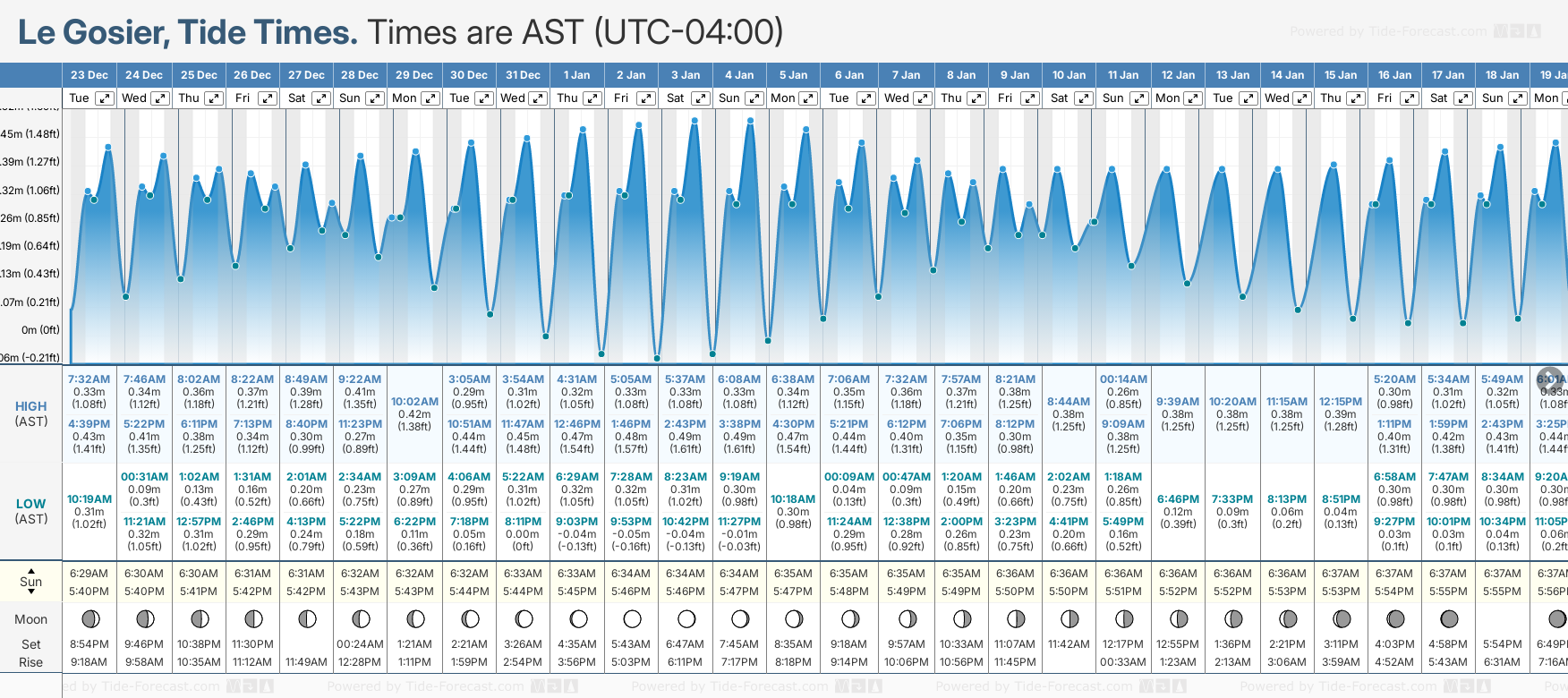 December and January Tide charts for Le Gosier: The tide charts below show the height, time and date of high and low tides for the next 30 days.