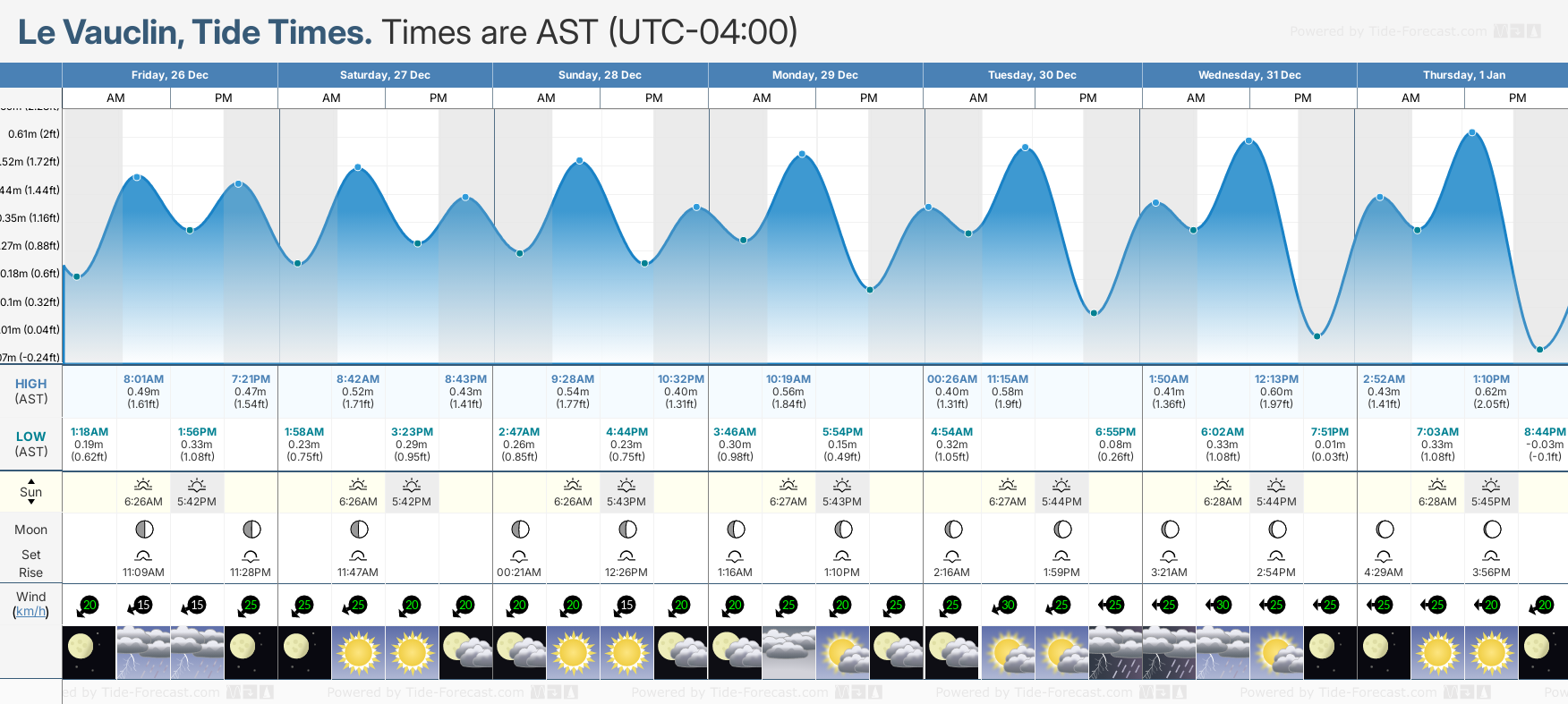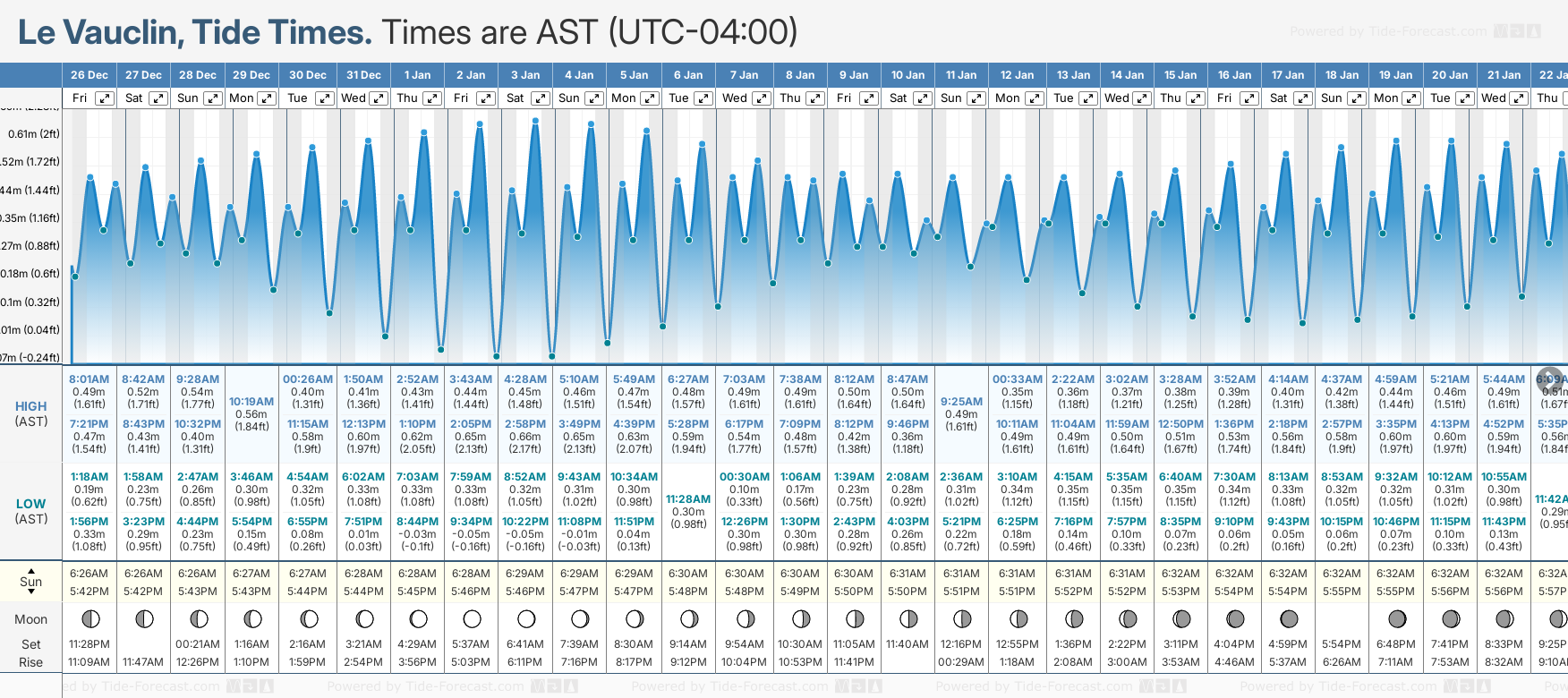 December and January Tide charts for Le Vauclin: The tide charts below show the height, time and date of high and low tides for the next 30 days.