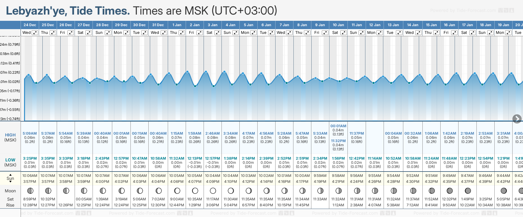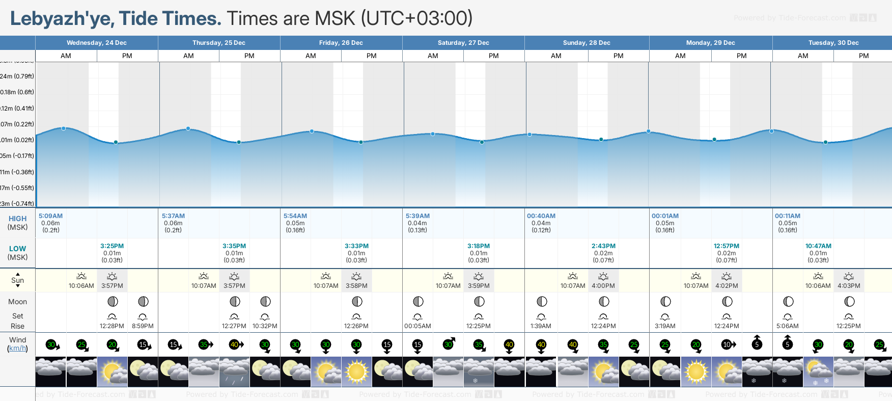 December and January Tide charts for Lebyazh'ye: The tide charts below show the height, time and date of high and low tides for the next 30 days.