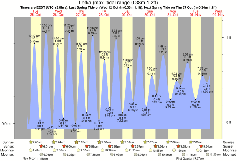 Tide Times are EET (UTC +2.0hrs). Last Spring High Tide at Lefka was on Sat 06 Dec (height: 0.35m 1.1ft). Next high Spring Tide at Lefka will be on Sun 21 Dec (height: 0.32m 1.0ft).