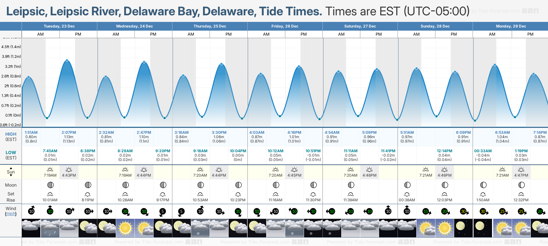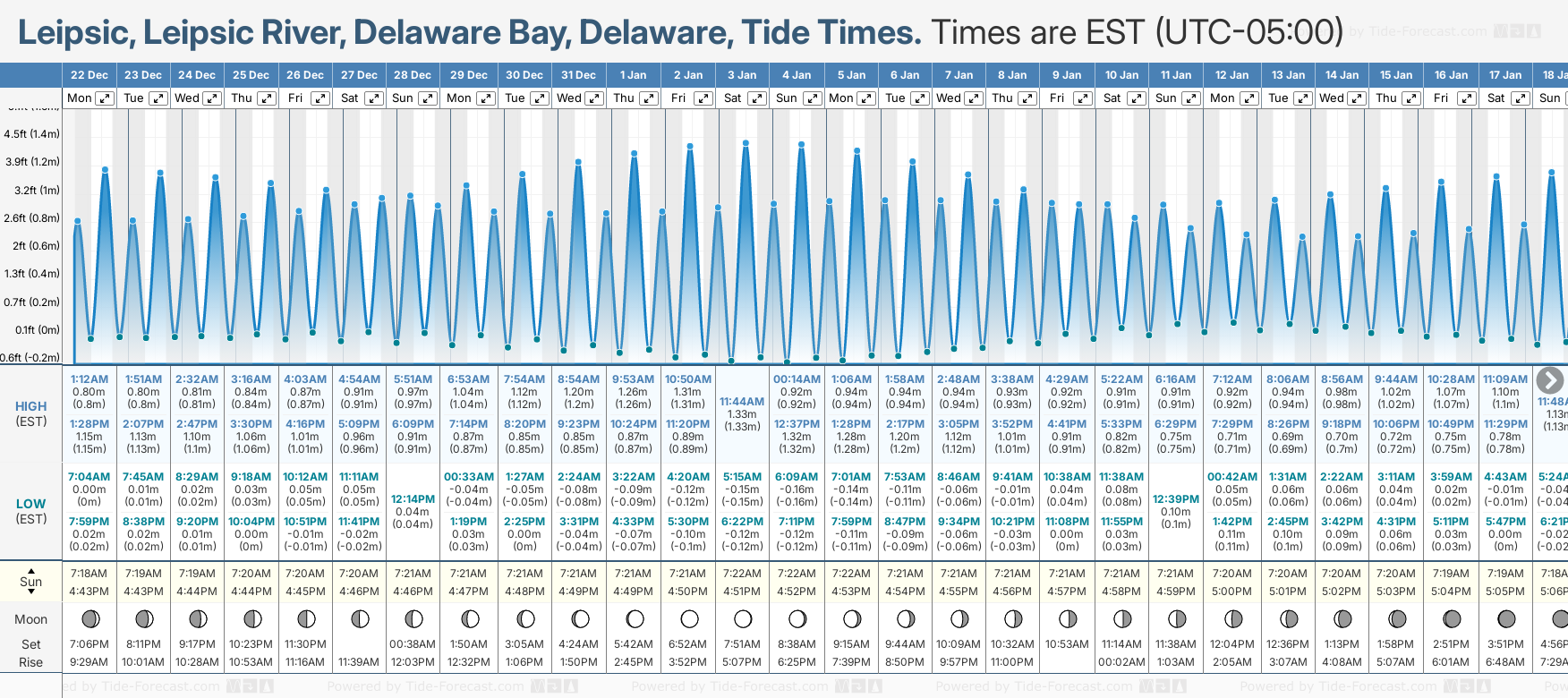 December and January Tide charts for Leipsic, Leipsic River Bay: The tide charts below show the height, time and date of high and low tides for the next 30 days.