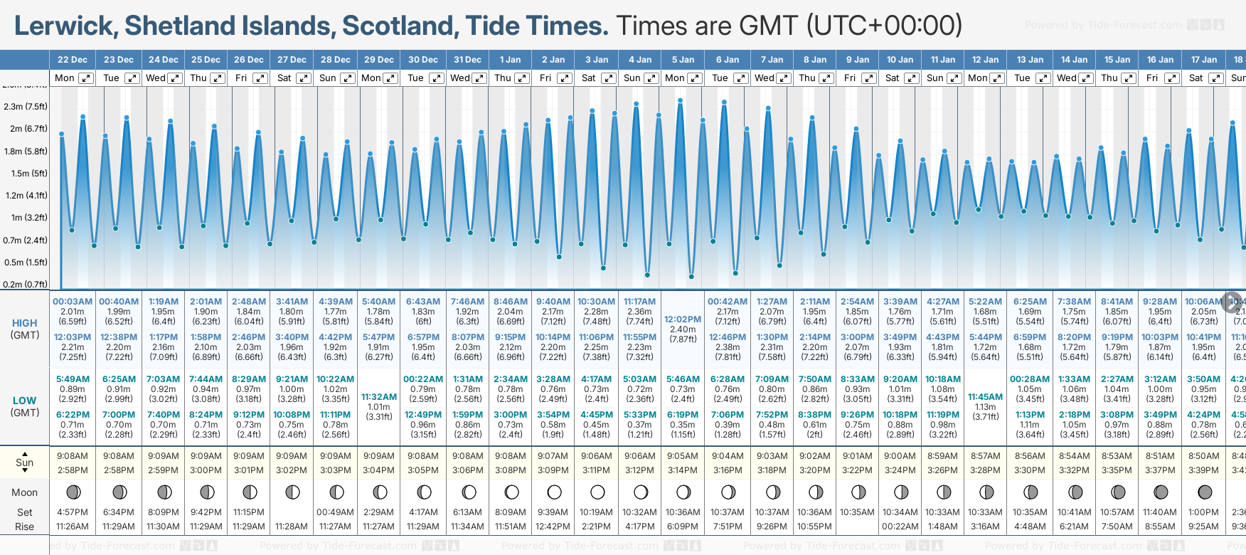 December and January Tide charts for Lerwick: The tide charts below show the height, time and date of high and low tides for the next 30 days.