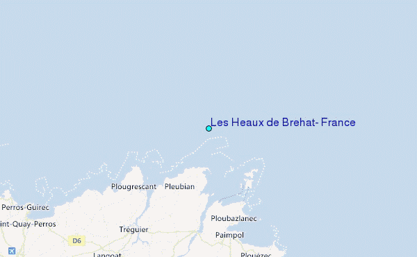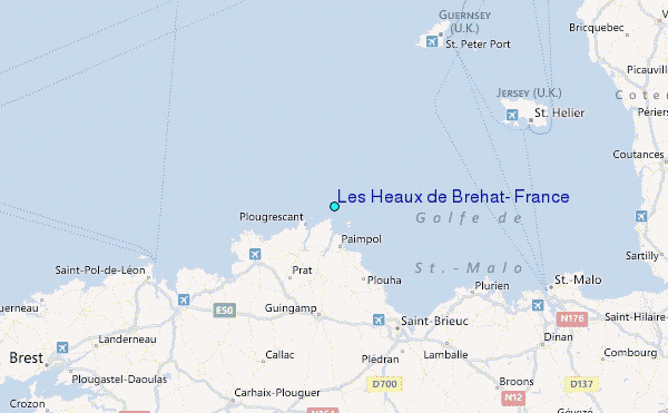 Use this relief map to navigate to tide stations, surf breaks and cities that are in the area of Les Heaux de Brehat, France.