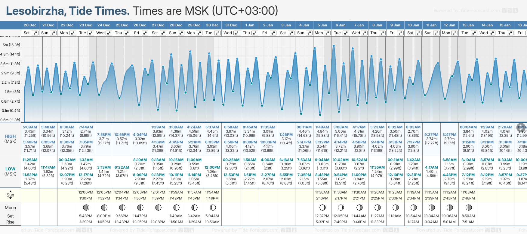 December and January Tide charts for Lesobirzha: The tide charts below show the height, time and date of high and low tides for the next 30 days.