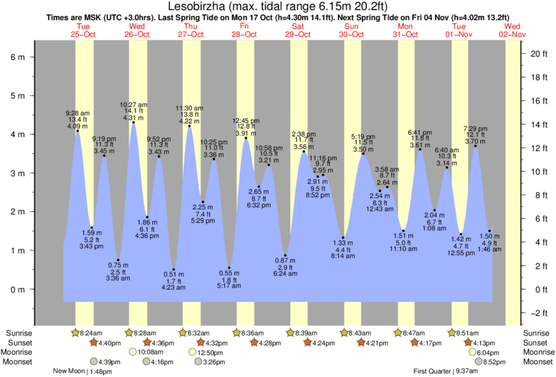 Tide Times are MSK (UTC +3.0hrs). Last Spring High Tide at Lesobirzha was on Tue 09 Dec (height: 4.74m 15.6ft). Next high Spring Tide at Lesobirzha will be on Mon 29 Dec (height: 4.59m 15.1ft).