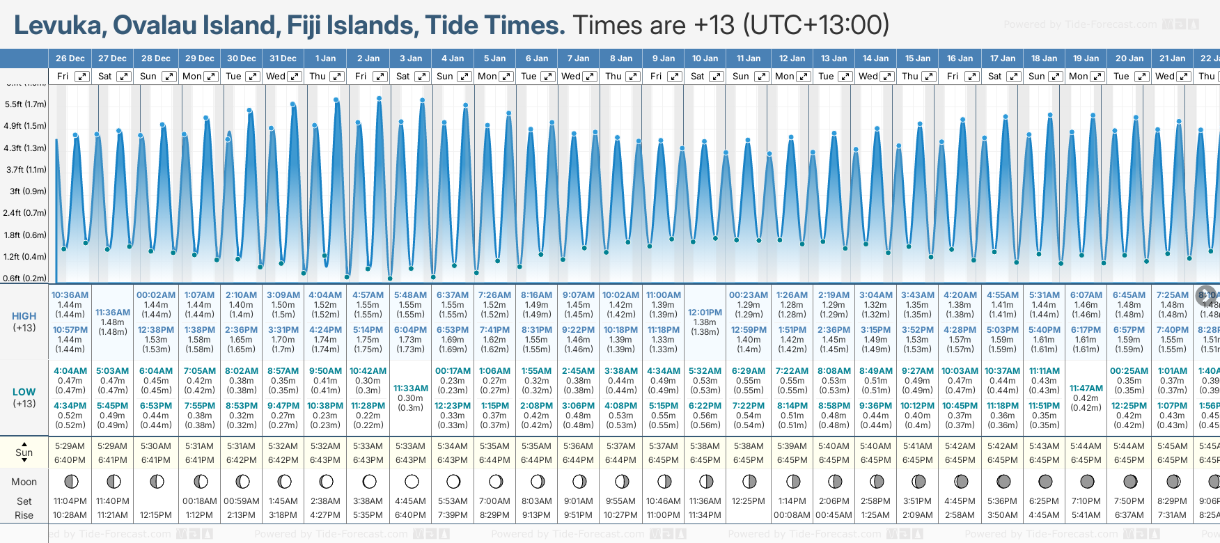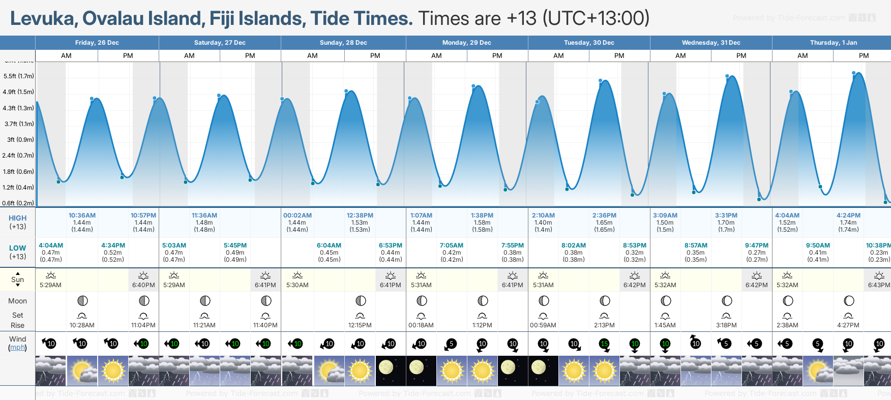 December and January Tide charts for Levuka, Ovalau Island: The tide charts below show the height, time and date of high and low tides for the next 30 days.