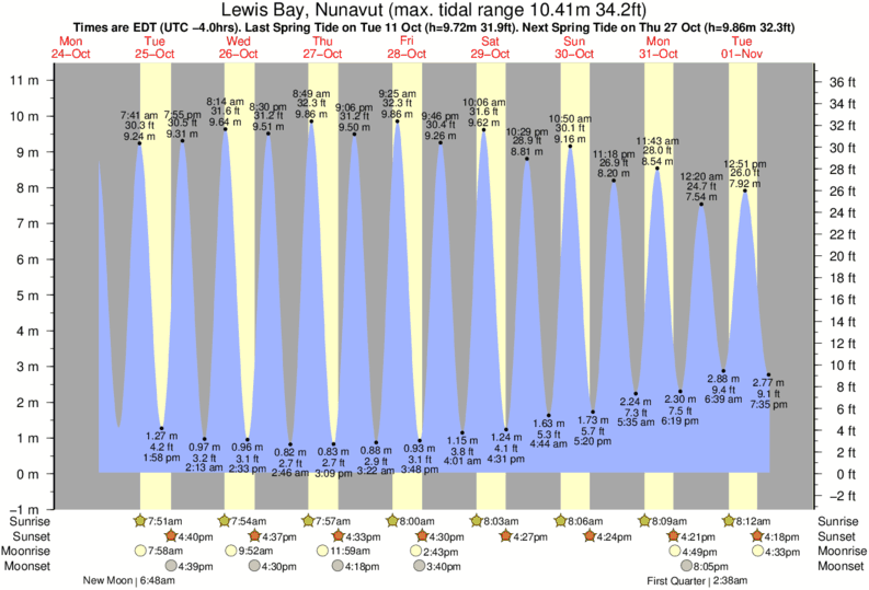 Lewis Bay tide chart key: The tide chart above shows the height and times of high tide and low tide for Lewis Bay, Nunavut. The grey shading corresponds to nighttime hours between sunset and sunrise at Lewis Bay.