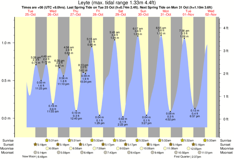 Tide Times are PST (UTC +8.0hrs). Last Spring High Tide at Leyte was on Mon 08 Dec (height: 1.20m 3.9ft). Next high Spring Tide at Leyte will be on Tue 23 Dec (height: 1.03m 3.4ft).