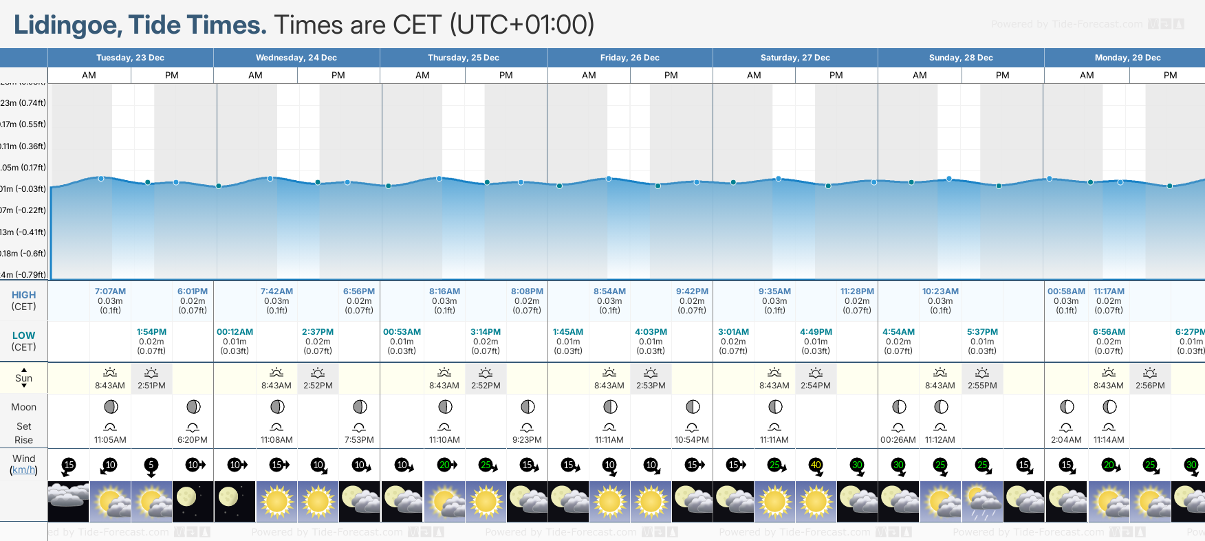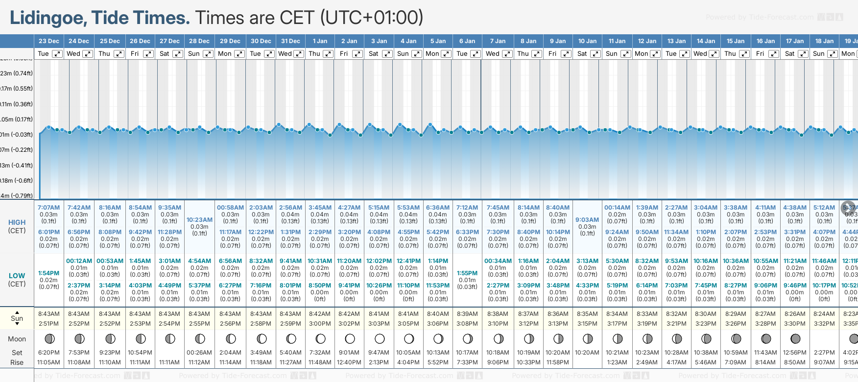 December and January Tide charts for Lidingoe: The tide charts below show the height, time and date of high and low tides for the next 30 days.