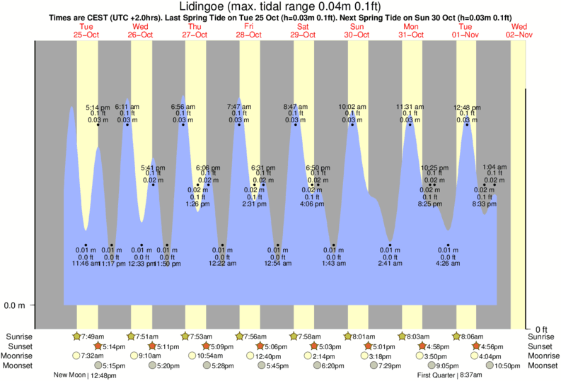 Tide Times are CET (UTC +1.0hrs). Last Spring High Tide at Lidingoe was on Sun 21 Dec (height: 0.03m 0.1ft). Next high Spring Tide at Lidingoe will be on Fri 26 Dec (height: 0.03m 0.1ft).