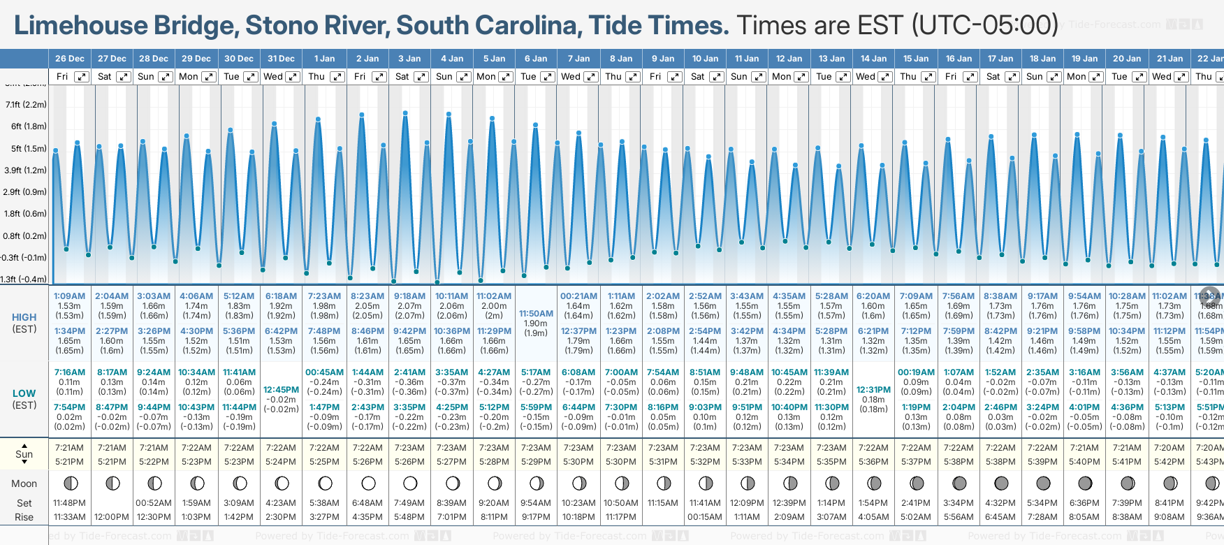 December and January Tide charts for Limehouse Bridge, Stono River: The tide charts below show the height, time and date of high and low tides for the next 30 days.