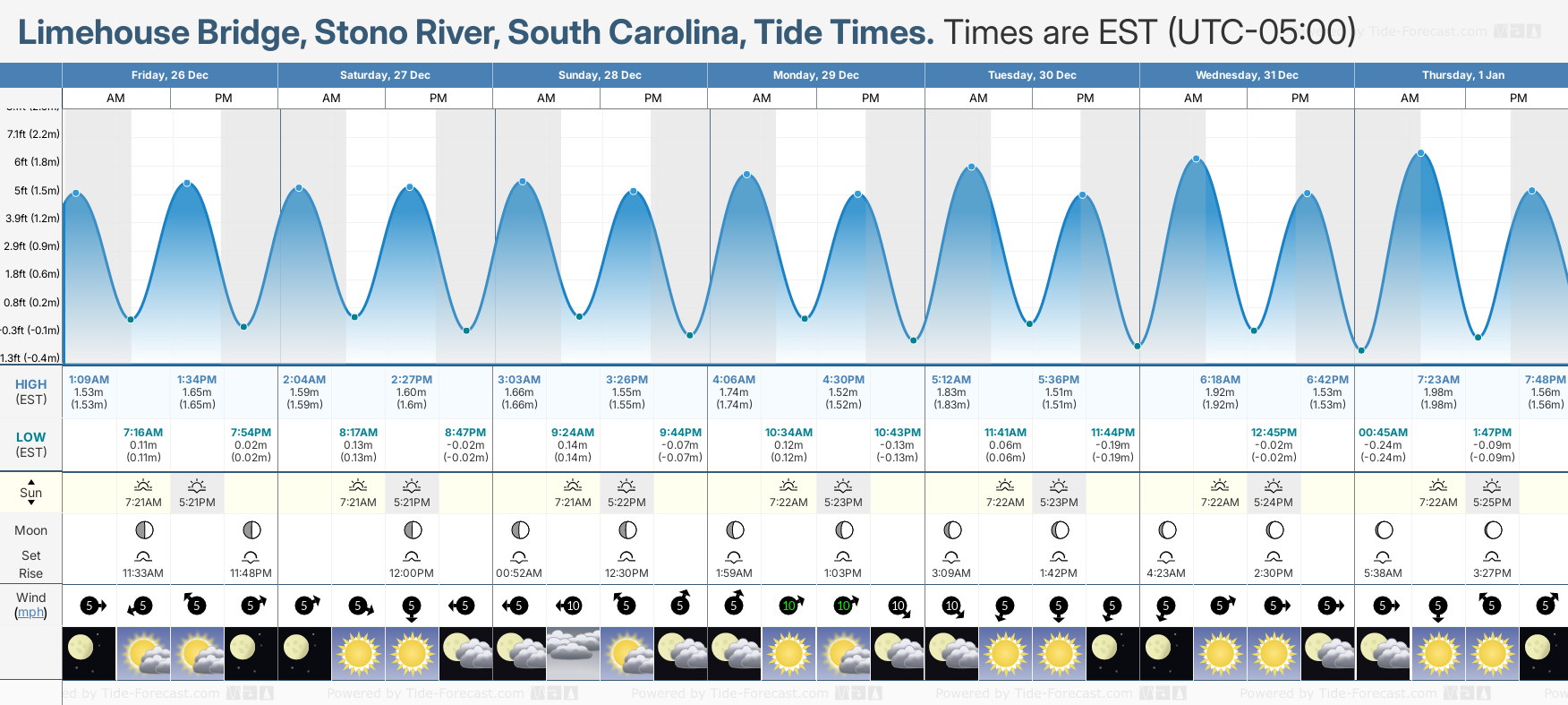 Limehouse Bridge, Stono River tide times for December and January