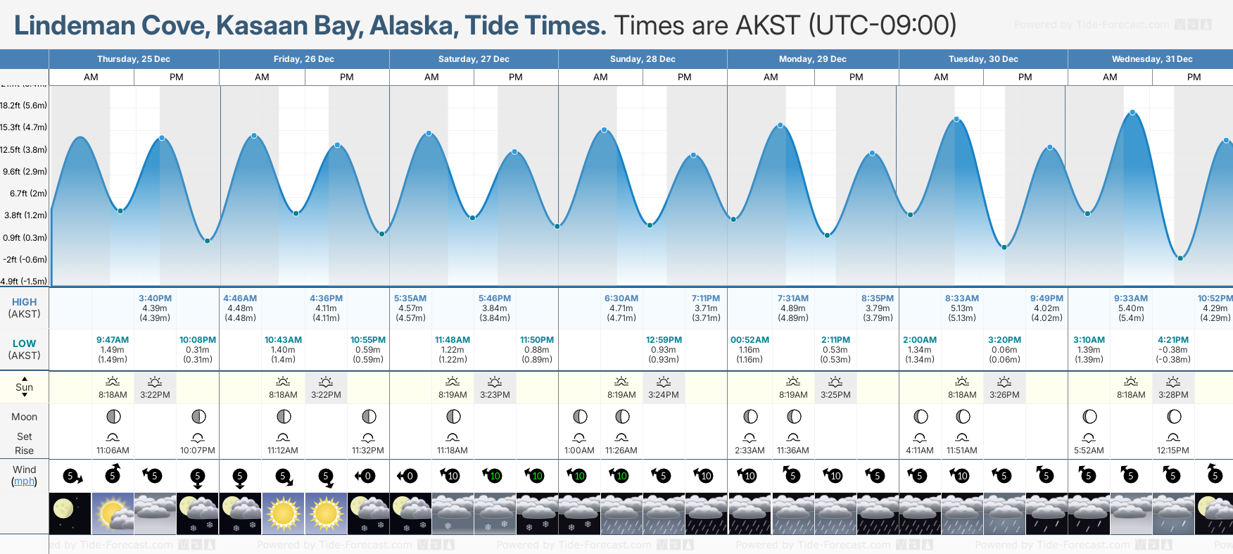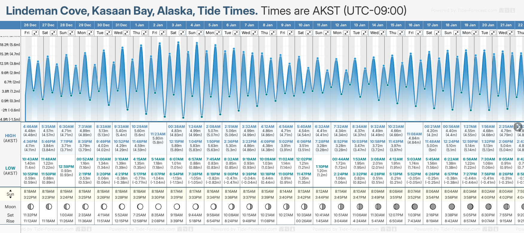 Tide Times are AKST (UTC -9.0hrs). Last Spring High Tide at Lindeman Cove, Kasaan Bay was on Fri 19 Dec (height: 5.08m 16.7ft). Next high Spring Tide at Lindeman Cove, Kasaan Bay will be on Sat 03 Jan (height: 5.89m 19.3ft).