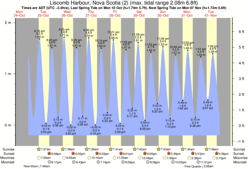 Tide Times are AST (UTC -4.0hrs). Last Spring High Tide at Liscomb Harbour (2) was on Fri 05 Dec (height: 1.83m 6.0ft). Next high Spring Tide at Liscomb Harbour (2) will be on Sun 21 Dec (height: 1.54m 5.1ft).