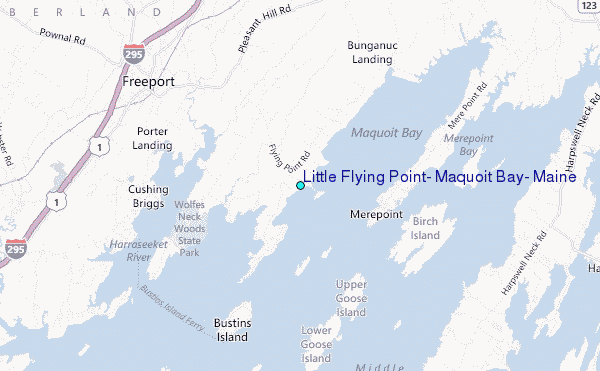 Use this relief map to navigate to tide stations, surf breaks and cities that are in the area of Little Flying Point, Maquoit Bay, Maine.