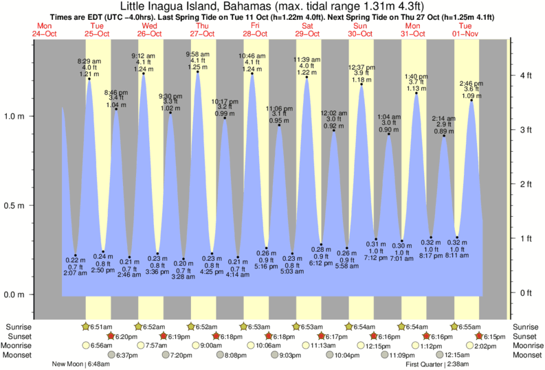 Tide Times are EST (UTC -5.0hrs). Last Spring High Tide at Little Inagua Island was on Sat 20 Dec (height: 1.03m 3.4ft). Next high Spring Tide at Little Inagua Island will be on Sat 03 Jan (height: 1.15m 3.8ft).