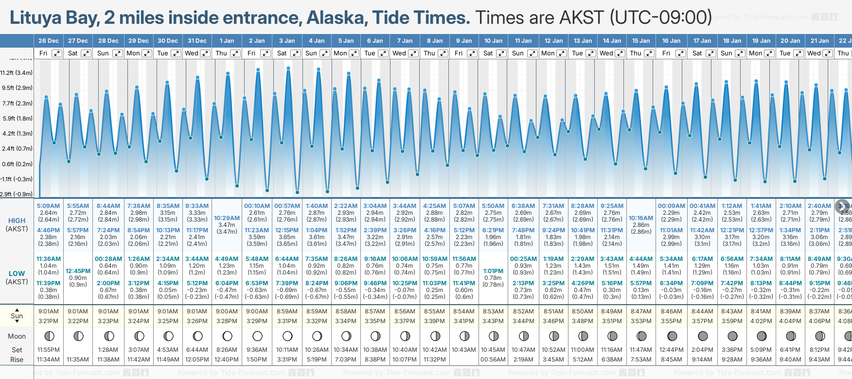 December and January Tide charts for Lituya Bay, 2 miles inside entrance: The tide charts below show the height, time and date of high and low tides for the next 30 days.