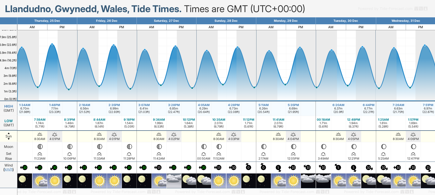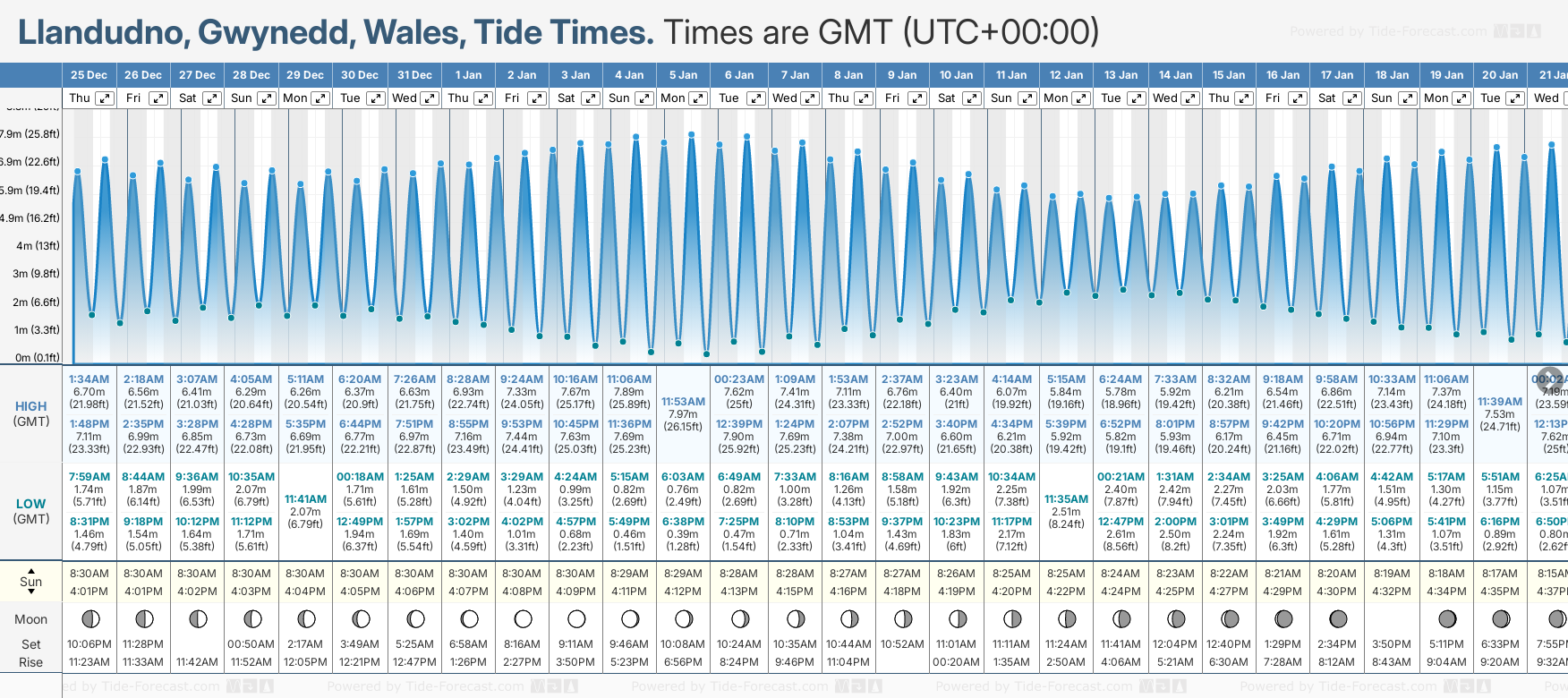 December and January Tide charts for Llandudno, Gwynedd: The tide charts below show the height, time and date of high and low tides for the next 30 days.