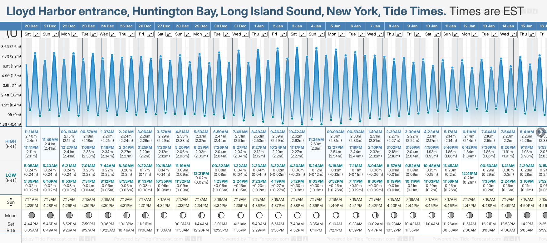 December and January Tide charts for Lloyd Harbor entrance, Huntington Bay, Long Island Sound: The tide charts below show the height, time and date of high and low tides for the next 30 days.
