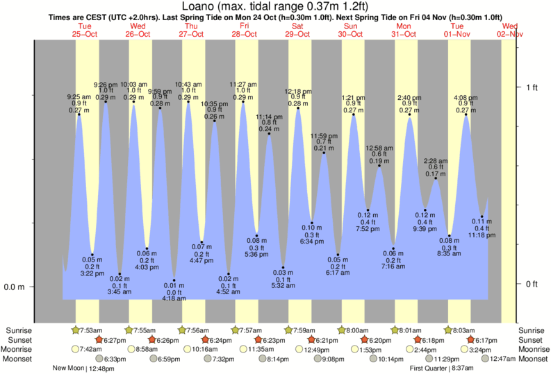 Tide Times are CET (UTC +1.0hrs). Last Spring High Tide at Loano was on Sat 20 Dec (height: 0.29m 1.0ft). Next high Spring Tide at Loano will be on Thu 25 Dec (height: 0.29m 1.0ft).